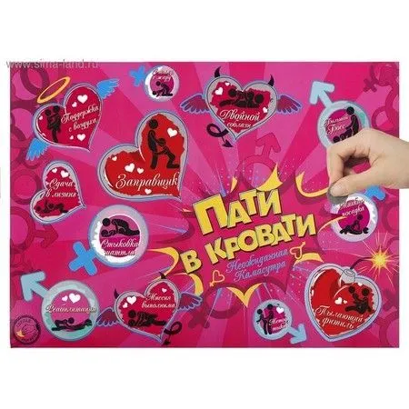 Плакат со стирающимся слоем бумаги «Пати в кровати» станет отличным подарком для раскрепощенных партнеров. Сувенир представляет собой карту со словесными призывами и спрятанными за ними картинками, демонстрирующими разные позы из секса. Для начала игры достаточно стереть одну из надписей на плакате и увидеть предлагаемое действие. Неожиданная камасутра порадует любовников, жаждущих непредсказуемости.