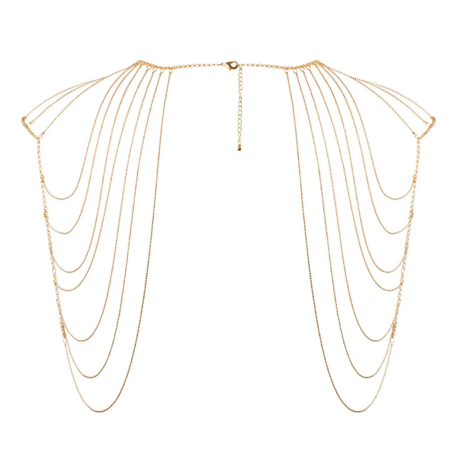 Элегантная золотистая цепочка из серии Magnifique от бренда Bijoux Indiscrets - это необычный аксессуар, который будет украшать плечи и спину, плавно очерчивая каждый их изгиб. Дизайн аксессуаров из серии Magnifique был навеян танцовщицами кабаре в Нью-Йорке двадцатых годов, чья чувственность и соблазнительность присутствовали в каждой детали их образа. При выходе в свет цепь поверх вечернего наряда подчеркнет Вашу элегантность, а в приватной обстановке с возлюбленным она превратится в оружие соблазнения. Наденьте ее на голое тело, если хотите свести своего партнера с ума от желания - это будет единственная вещь, которую он не захочет с Вас снимать!
