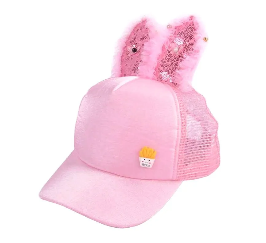 Милая детская кепочка с забавными ушками будет отличным подарком для любой девочки! Кепка станет стильным украшением для любой маленькой модницы, ведь она богато декорирована рюшами, цветными шариками и блестками, которые будут весело сверкать на солнце. Также над козырьком есть небольшое украшение в виде забавной картошки-фри. Такая кепка спасет ребенка от яркого солнца и прекрасно подойдет для длительных прогулок на природе. Размер кепки можно регулировать.