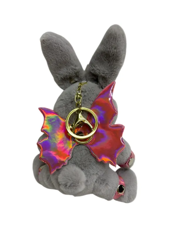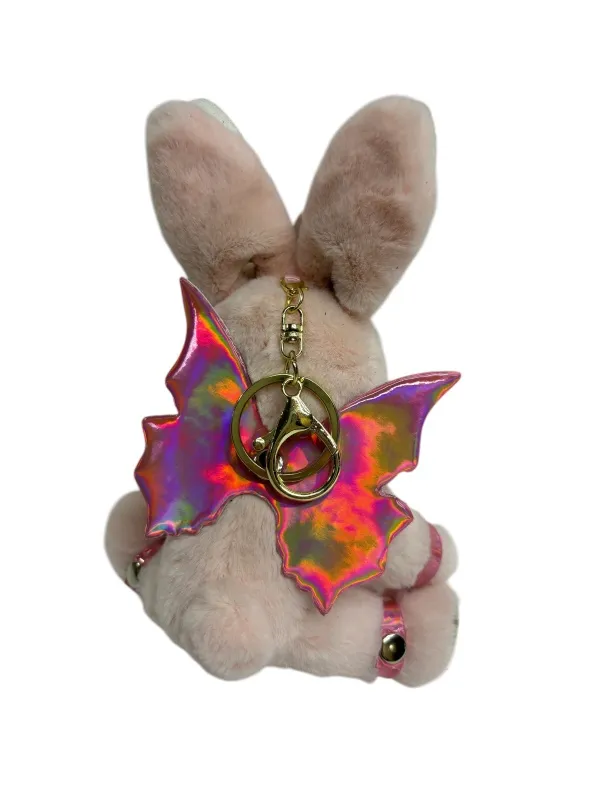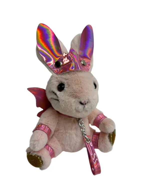 Зайчик- фея попал в сладкий плен, поэтому на его шее красуется ошейник с поводочком, который не дает фее упархнуть от своего хозяина. Но крылышки все еще напоминают о его волшебной сути. Пристегните фею к своей второй половинке, чтобы она всегда была рядом! Игрушка оснащена карабином и кольцом, её можно носить в качестве брелока на ключах или сумке. Высота зайчика 18 см, очень удобный размер. Костюмчик выполнен из розовой голографической эко-кожи. Цвет зайчиков в ассортименте.