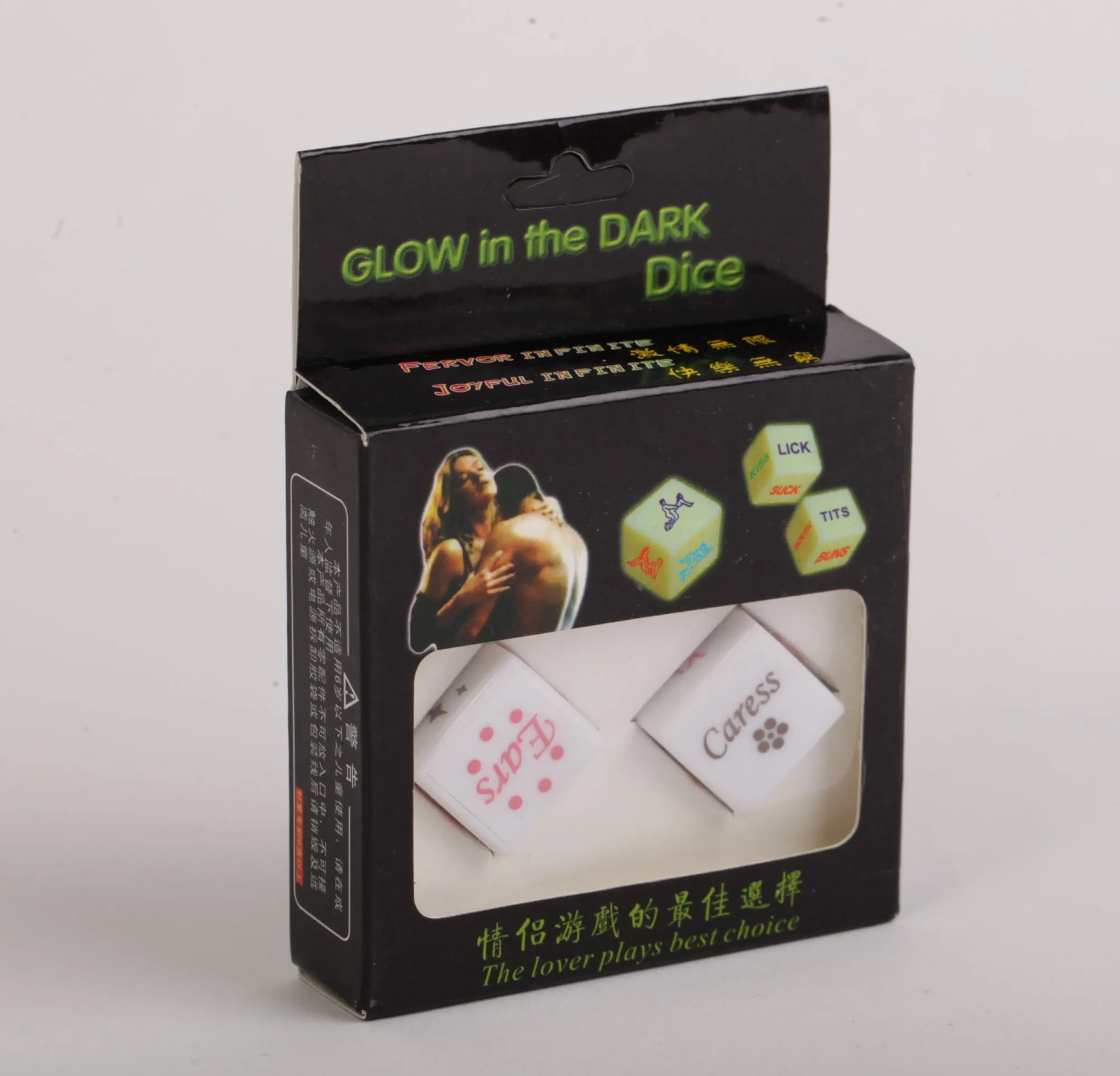 Игровые кости для семейных пар и любовников. Разнообразит Вашу семейную жизнь и преподнесёт неожиданность и новизну. Кости начинают светиться и мигать при броске. Материал- пластик. Страна изготовления- Китай.