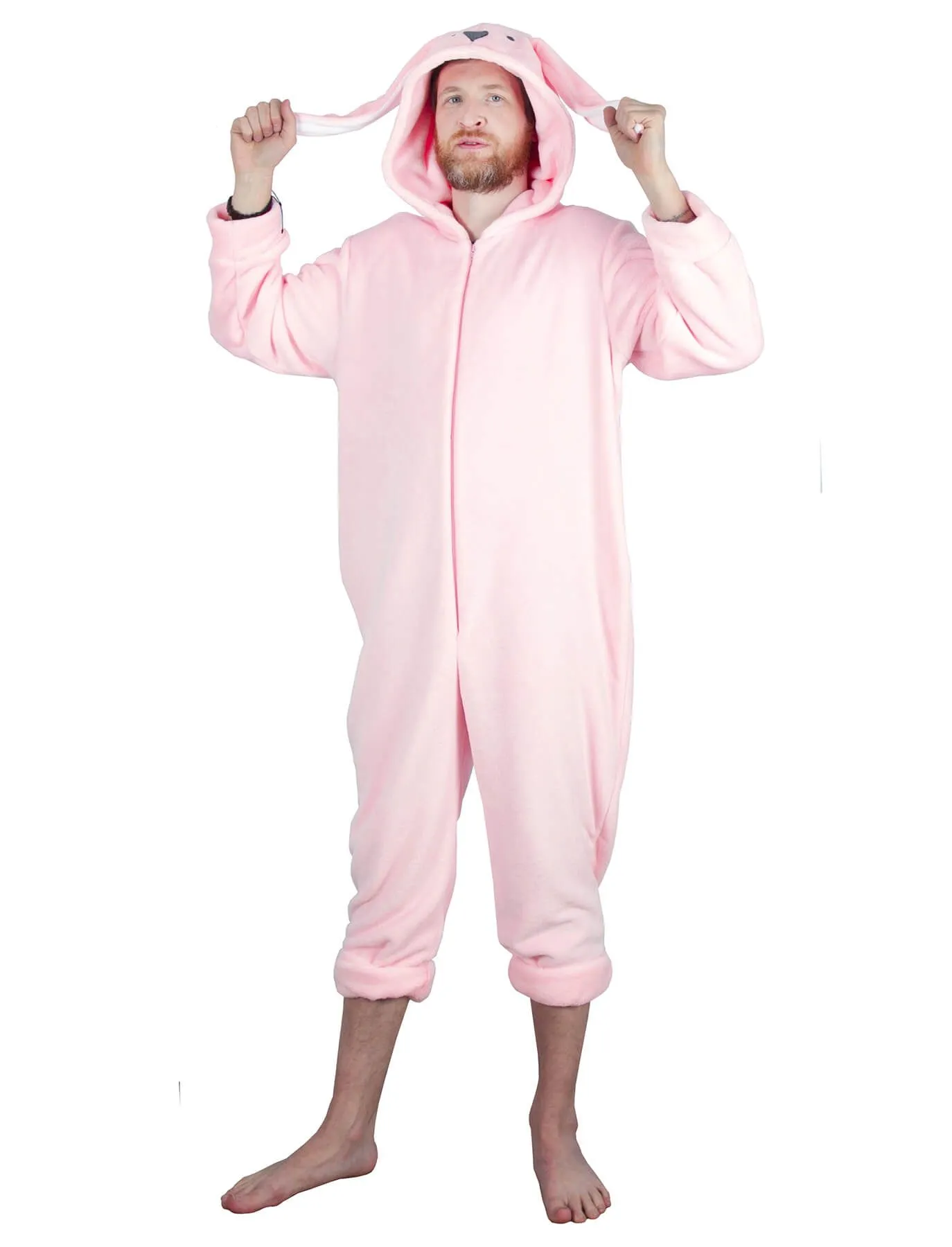Оригинальный и тёплый комбинезон-пижама «Зайка» в виде большого розового кролика с мордочкой и ушками на капюшоне обязательно станет украшением вашего гардероба. Его легко снимать и надевать благодаря всего одной молнии на костюме. На комбинезоне отсутствуют сжимающие резинки и натирающие элементы, а его мягкий материал подарит тепло зимой и прохладу летом. Подходит как женщинам, так и мужчинам.