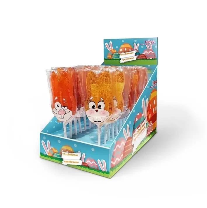 Леденец на палочке в виде кролика с длинными ушками от компании Lenco сделан в трех разных вкусах: клубника, апельсин и "Эко" (без аромата). Такая забавная конфета с нежным клубничным или ярким апельсиновым вкусом будет отличным подарком для Вашей второй половинки или друзей. Вы можете побаловать и себя этим сладким угощением, ведь леденцы любят все, а особенно настолько прекрасно и необычно оформленные.