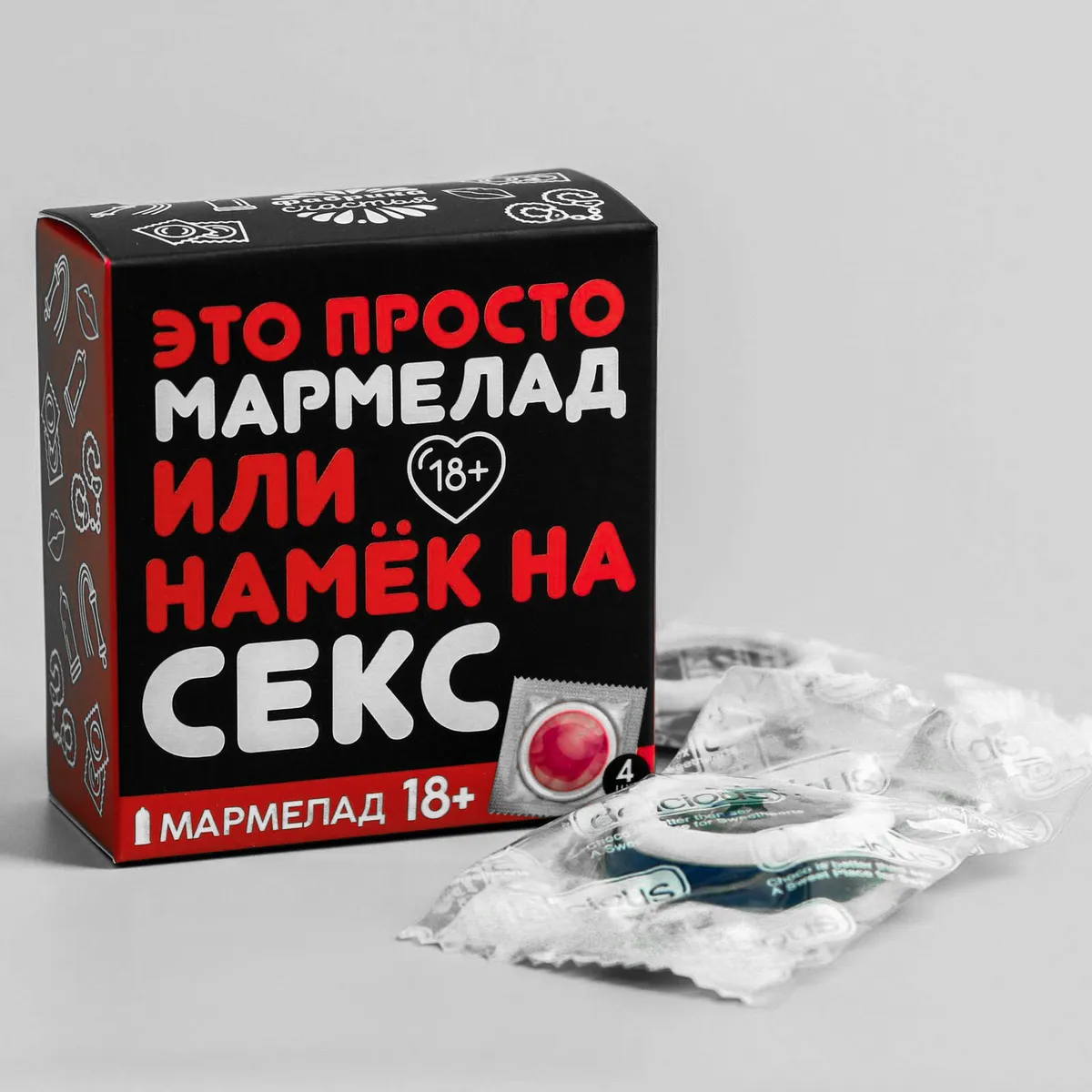 Необычный подарок для ваших друзей. Осторожно, только для взрослых! Мармелад 18+ "Это просто мармелад". Яркий дизайн упаковки порадует получателя такого подарка, а яркий фруктовый вкус точно не оставит равнодушным. В комплекте 4 мармеладки в индивидуальной упаковке.