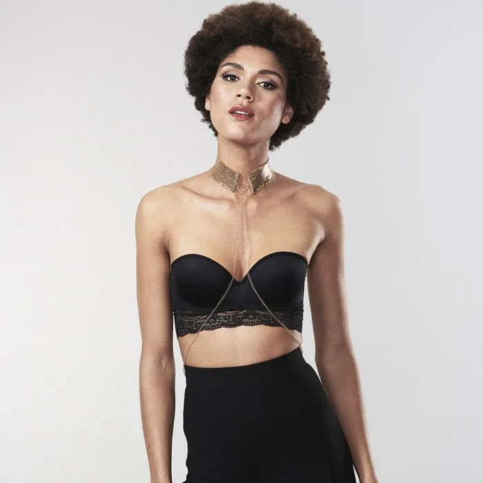 Элегантное колье Desir Metallique от бренда Bijoux Indiscrets - это необычный аксессуар, который можно использовать и как изысканное украшение, и как ошейник. Две цепочки проходят по линии груди и застегиваются на спине, а третья может использоваться в качестве поводка во время ролевых игр, однако при желании ее можно снять.