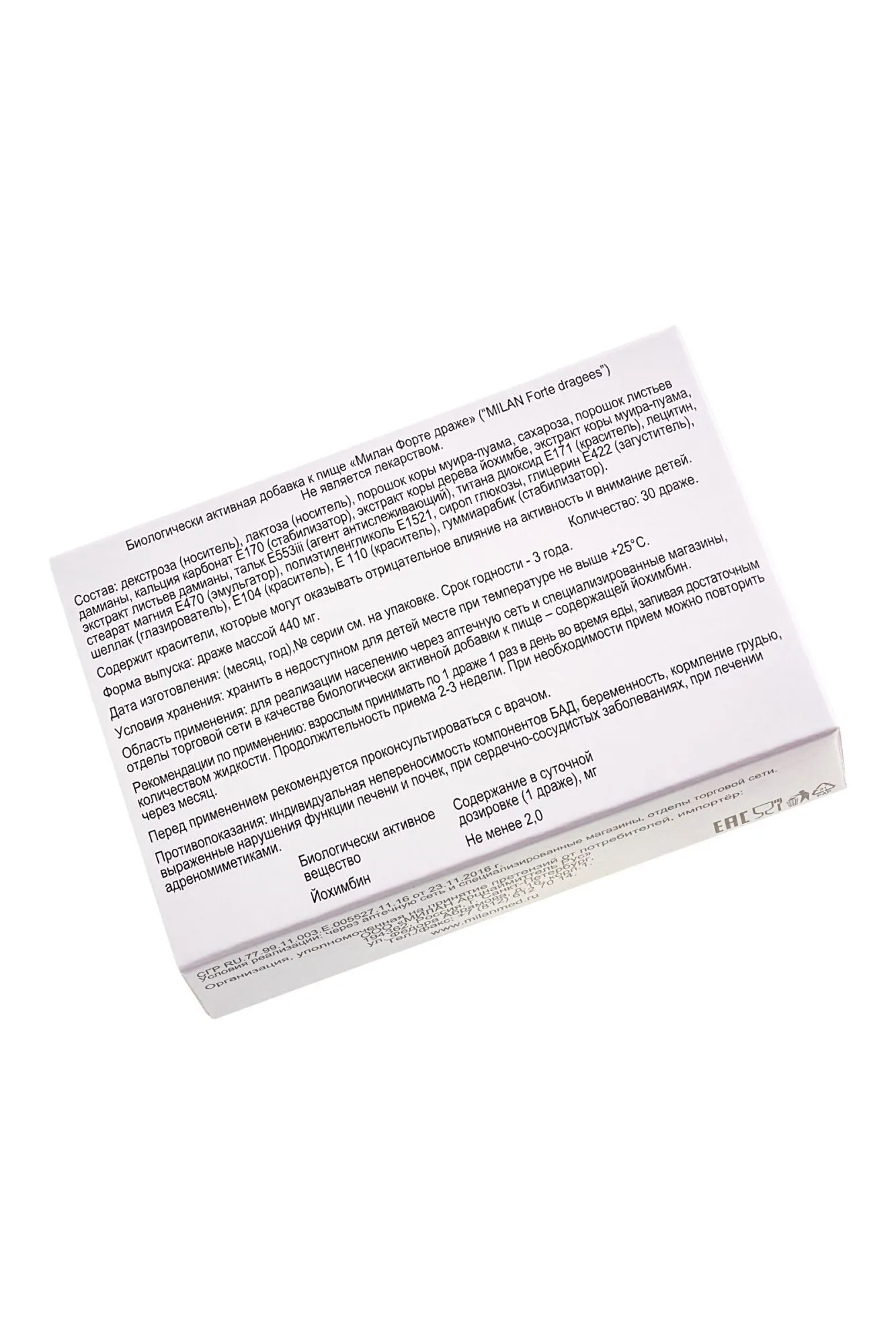 Немецкий препарат Милан Форте – это комплекс из известных и проверенных афродизиаков, входящих в состав добавки, пробуждают чувственность и сексуальную энергию мужчин и женщин. улучшает эрекцию, устраняет нарушения потенции усиливает сексуальное желание способствует расширению сосудов и повышению кровоснабжения половой области. Милан Форте помогает преодолеть комплекс неполноценности и вернуть способность к полноценной половой жизни. Применим для мужчин и женщин, а также для людей, страдающих диабетом. Для чего: Для повышения либидо, улучшения эрекции, при сексуальной дисгармонии пар. Для кого: Для мужчин и женщин, которые стремятся получить более яркие ощущения от секса, повысить либидо, укрепить отношения. Рекомендации по применению: взрослым принимать по 1 драже 1 раз в день во время еды, запивая достаточным количеством жидкости. Продолжительность приема 2-3 недели. При необходимости прием можно повторить через месяц. Состав: декстроза (носитель), лактоза (носитель), порошок коры муира-пуама, сахароза, порошок листьев дамианы, кальция карбонат (стабилизатор), экстракт коры дерева йохимбе, экстракт коры муира-пуама, экстракт листьев дамианы, тальк (агент антислеживающий), титана диоксид (краситель), лецитин, стеарат магния (эмульгатор), полиэтиленгликоль, сироп глюкозы, глицерин (загуститель), шеллак (глазирователь), Е104 (краситель), Е 110 (краситель), гуммиарабик (стабилизатор). Противопоказания: индивидуальная непереносимость компонентов, беременность, лактация Форма выпуска: 30 драже массой 440 мг Срок годности: 3 года БАД, НЕ ЯВЛЯЕТСЯ ЛЕКАРСТВОМ.