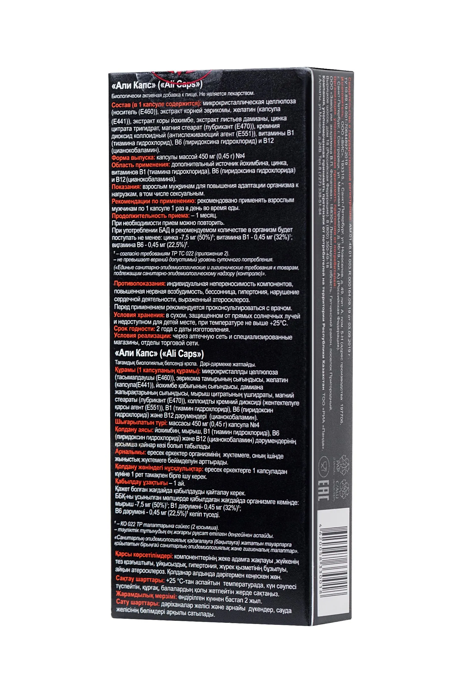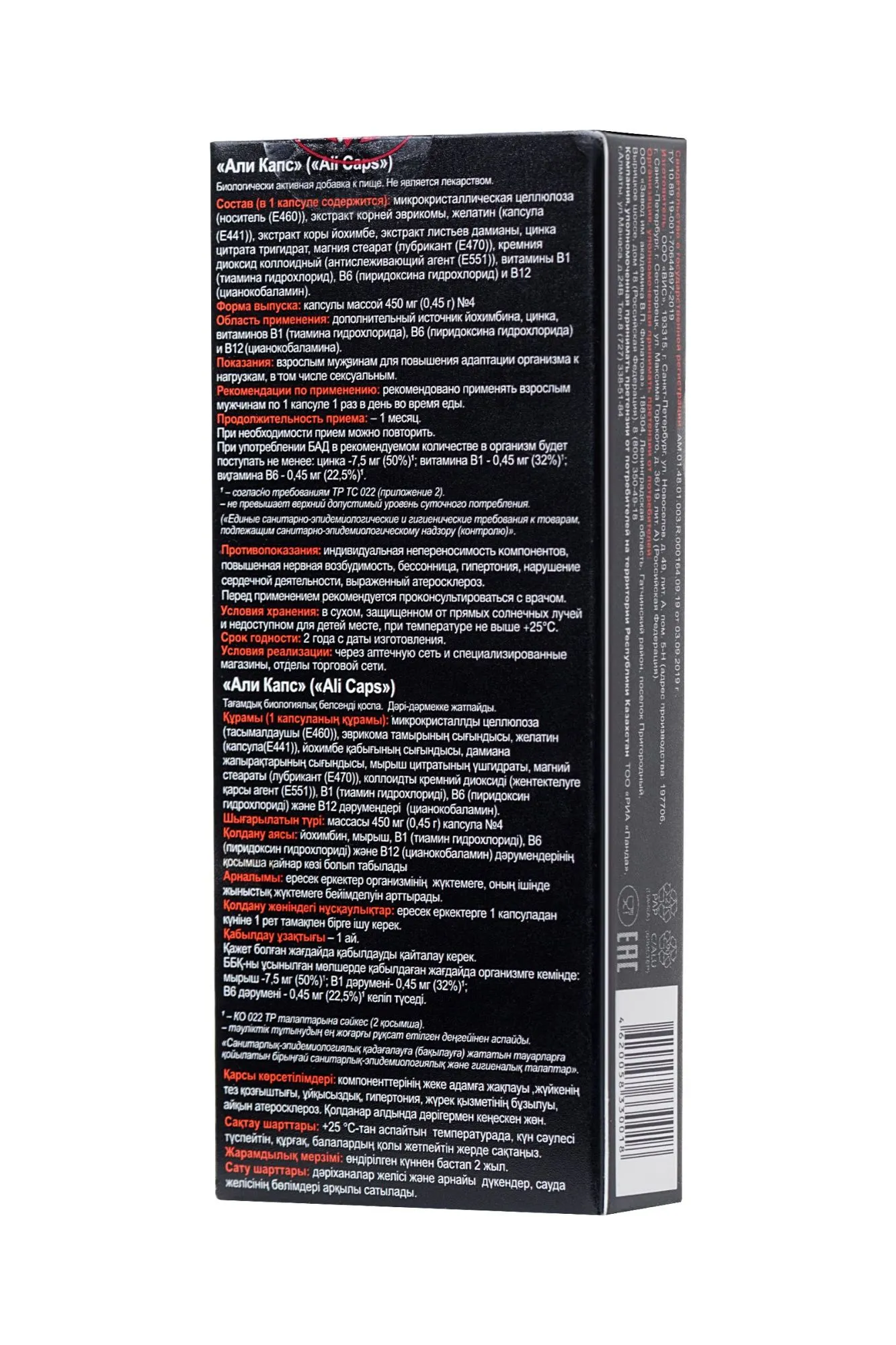 На здоровье современного мужчины оказывает влияние множество неблагоприятных факторов – обилие стрессов, увеличение рисков техногенного и экологического характера. А как хочется достичь активного долголетия! Как говорится: “Здоровье — это ещё не всё, но всё без здоровья – это ничто”. Особое значение приобретает здоровый образ жизни, избавление от вредных привычек, правильное питание. Свойства компонентов целебного растительного комплекса “АЛИ КАПС®” способствуют как общему оздоровлению организма, так и процессам нормального функционирования мочеполовой системы мужчин. Рекомендуется взрослым мужчинам для повышения полового влечения и адаптации организма к нагрузкам, в том числе сексуальным. А также в качестве дополнительного источника йохимбина, цинка и витаминов В1 (тиамина гидрохлорида), В6 (пиридоксина гидрохлорида) и Б12 (цианокобаламина), сапонинов для мужчин. Рекомендации по применению: Взрослым мужчинам по 1 капсуле 1 раз в день во время еды. Продолжительность приема 1 месяц. При необходимости прием можно повторить. Состав: Экстракт корней эврикомы, Кора йохимбе, Экстракт листьев дамианы, Цинк, Витамин В1, Витамин В12, Витамин В6 Противопоказания: Индивидуальная непереносимость компонентов, повышенная нервная возбудимость, бессонница, гипертония, нарушение сердечно-сосудистой деятельности, выраженный атеросклероз. Форма выпуска: 4 капсулы массой 0,45 г БАД, НЕ ЯВЛЯЕТСЯ ЛЕКАРСТВОМ.