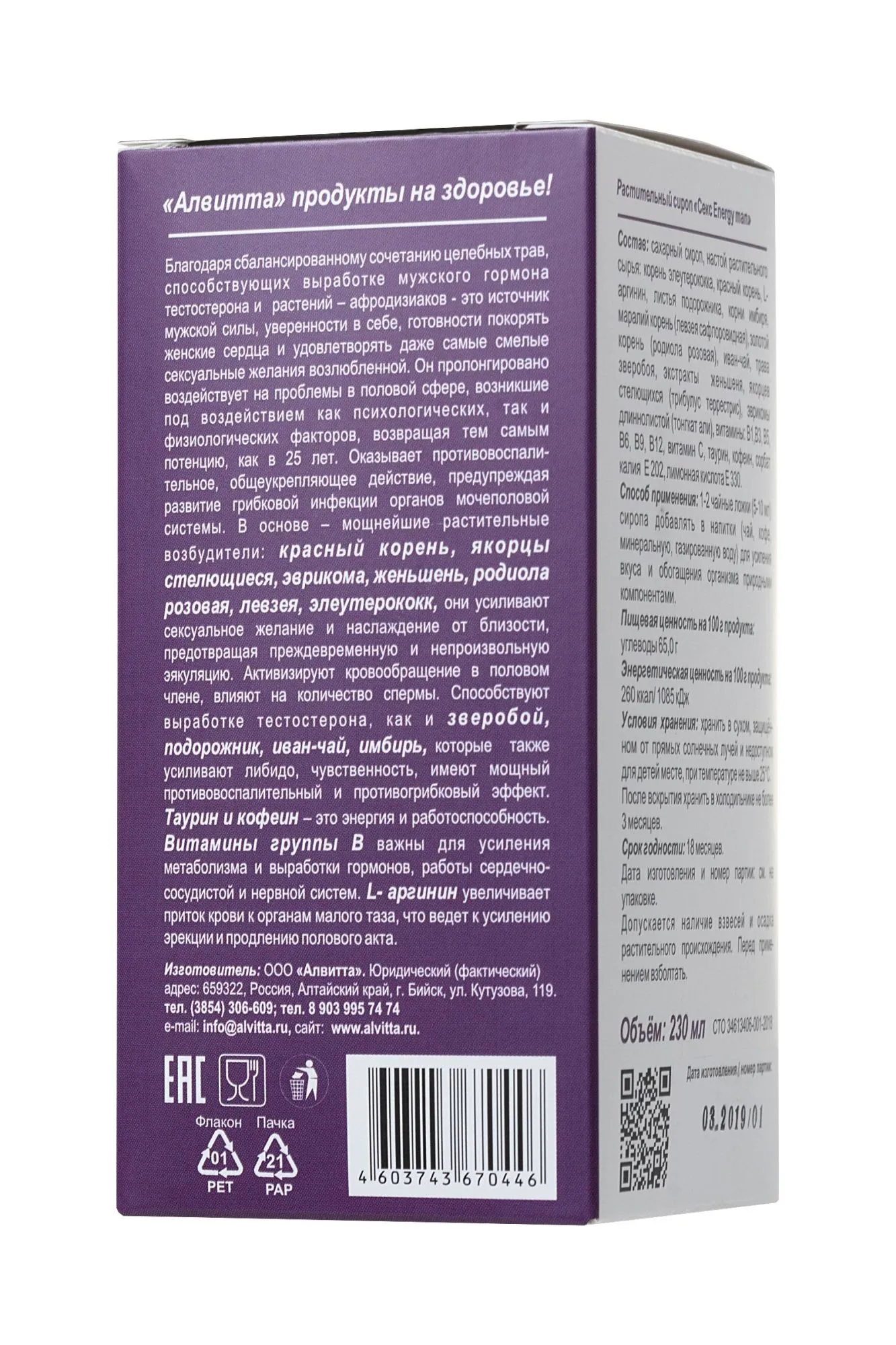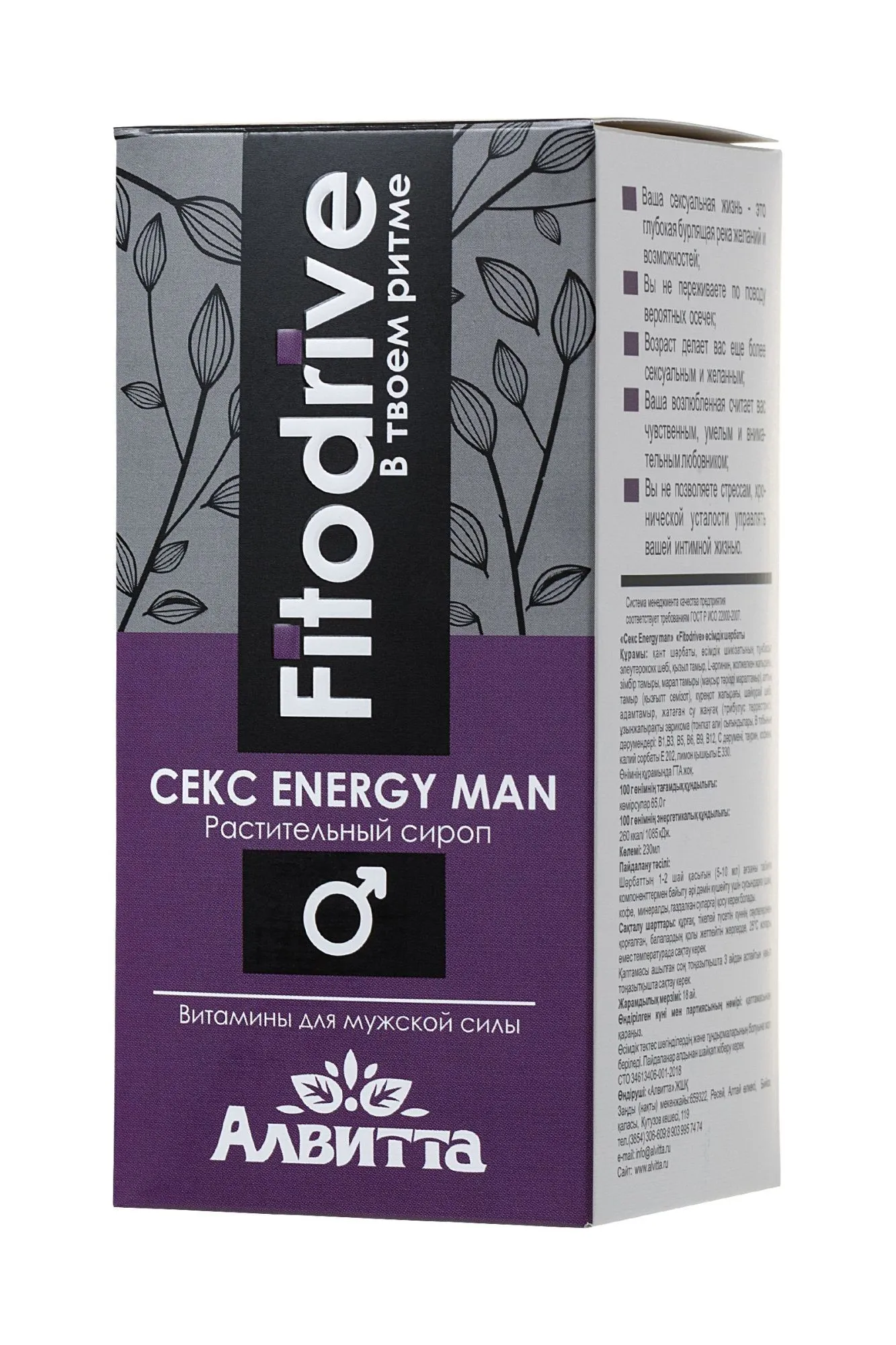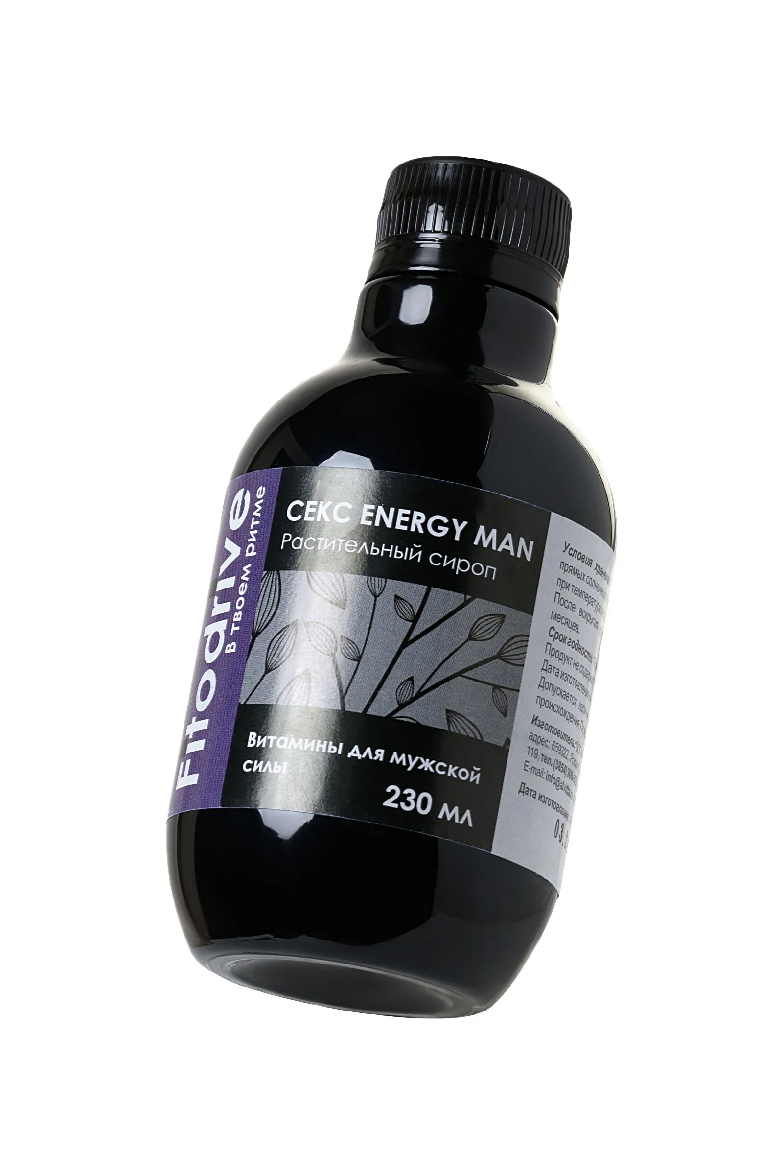 Какова цена отличного настроения, жизнерадостности, сексуальной активности и мужского здоровья? Ловите себя на том, что ощущаете усталость, апатию и отсутствие желания? Растительный сироп для мужчин “Секс energy man” Fitodrive от Алвитта - 100% потенция, источник мужской силы, уверенности в себе, готовности покорять женские сердца и удовлетворять даже самые смелые сексуальные желания возлюбленной. Это необыкновенно мощное по своему воздействию средство для нормализации потенции. “Секс energy man” способствует нормализации работы мужского достоинства при нарушении эрекции (единичном или хроническом), снижении либидо, отсутствии чувства удовлетворения при половой близости, а также при непроизвольной и преждевременной эякуляции. Благодаря сбалансированному сочетанию целебных трав, способствующих выработке мужского гормона тестостерона и растений-афродизиаков пролонгировано воздействует на источники проблем в половой сфере, возникшие под воздействием как психологических, так и физиологических факторов. Активные компоненты: красный корень, тонгкат али, женьшень, родиола розовая, левзея, элеутерококк, зверобой, подорожник, иван-чай, имбирь, таурин, кофеин. Рекомендации по применению: по 2-3 чайные ложки сиропа (10-15 мл) добавлять в напитки (чай, кофе, вода) для усиления вкуса и обогащения организма природными компонентами. Перед применением взболтать. Пищевая ценность на 100 г продукта: углеводы 50,0 г. Энергетическая ценность на 100 г продукта: 200 ккал/ 830 кДж. Продукт не содержит ГМО. Условия хранения: хранить в защищенном от прямых солнечных лучей и недоступном для детей месте, при температуре не выше 25°С и относительной влажности не более 75%. После вскрытия хранить в холодильнике не более 3 месяцев. Срок годности: 18 месяцев. Объем: 230 мл