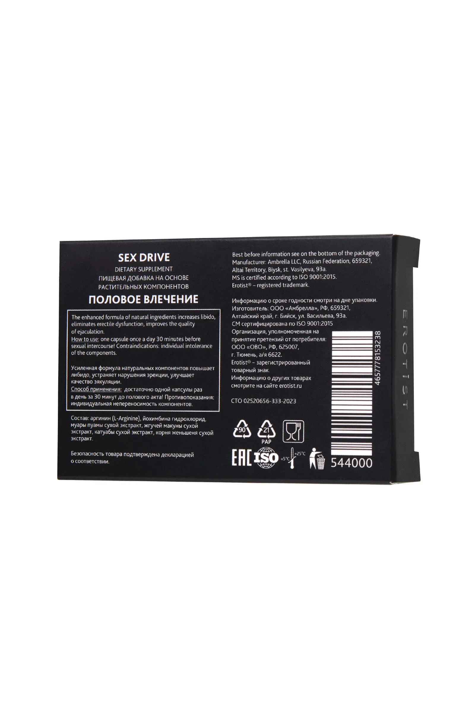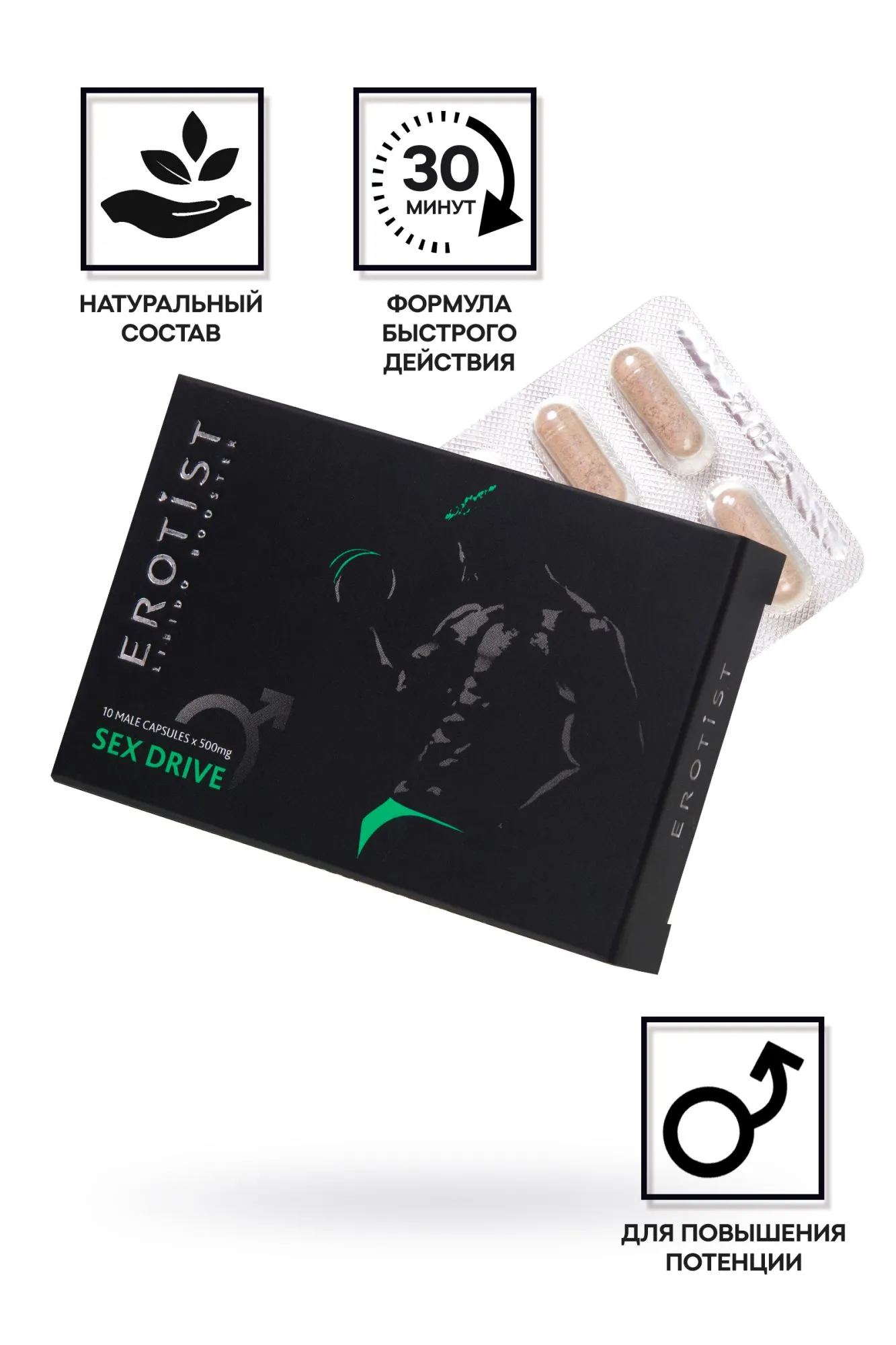 Стимулирующая пищевая добавка для мужчин на основе растительных компонентов капсулы Sex Drive подготавливает организм к продолжительному, яркому и качественному сексу, обладает эффективным действием – усиленная формула натуральных компонентов устраняет нарушения эрекции и улучшает качество эякуляции. Капсулы Sex Drive не только поднимают либидо, пробуждают желание близости и разжигают страсть, но и усиливают половую активность улучшают мужскую силу помогают обрести контроль над семяизвержением, что способствуют увеличению длительности полового акта улучшают качество семени и увеличивают его количество за счет увеличения уровня тестостерона, повышают удовлетворенность интимным контактом. восстанавливают эрекцию и устраняют ее торможение. Действие активных компонентов направлено на повышение способности вырабатывать клетками тканей оксида азота в момент сексуальной активности. Этот механизм запускает процессы расслабления гладких мышц и наполнения пещеристых тел полового члена кровью. Благодаря высокому содержанию йохимбина гидрохлорида Sex Drive стимулирует работу центральной нервной системы, вызывает расширение генитальных артерий и улучшает кровоснабжение органов малого таза, повышая половую функцию. Комплекс рекомендуется использовать для восполнения дефицита минеральных компонентов и витаминов, развивающегося на фоне следующих состояний: при преждевременной эякуляции; при бесплодии; при половом инфантилизме; при гормональных нарушениях (ослабление половой функции, нарушение эрекции, снижение либидо). Рекомендации по применению: взрослым мужчинам по 1 таблетке за 30 минут до полового акта. Не содержит гормонов, не вызывает привыкания. Основные действующие компоненты: Аргинин (L-Arginine) способствует увеличению в крови количества свободного NO. Окись азота выступает самым мощным природным вазодилататором. Благодаря этой функции удается улучшить микроциркуляцию в области органов малого таза, что ведет к усилению эрекции и продлению полового акта. Расширяет кровеносные сосуды полового члена и усиливает приток крови к органам малого таза. В результате этого у мужчины возникает твердая и длительная эрекция, увеличивается продолжительность полового акта. Помимо улучшения потенции, аргинин влияет на состав спермы и предотвращает мужское бесплодие. Йохимбин гидрохлорид относится к афродизиакам, способным усилить потенцию. Механизм фармакологического действия йохимбина обусловлен селективной блокадой центральных и периферических, расположенных в кавернозной ткани и кавернозных артериях пресинаптических альфа2-адренорецепторов. Экспериментально установлено, что йохимбин нормализует половую функцию и способность к коитусу, ослабленную в результате стресса, устраняет торможение эрекции, вызванное стимуляцией α2-адренорецепторов, оказывает стимулирующее влияние на центральную нервную систему. Не влияет на генетический аппарат спермиев. Муира пуама способствует повышению сексуального желания путем прямого воздействия на центральную нервную систему, увеличивает производство гормонов. Жгучая макуна влияет на выработку тестостерона, способствует повышению либидо, увеличения количества спермы и выработку спермотозоидов. Катуаба рекомендуется для повышения мужской потенции и сексуальной выносл