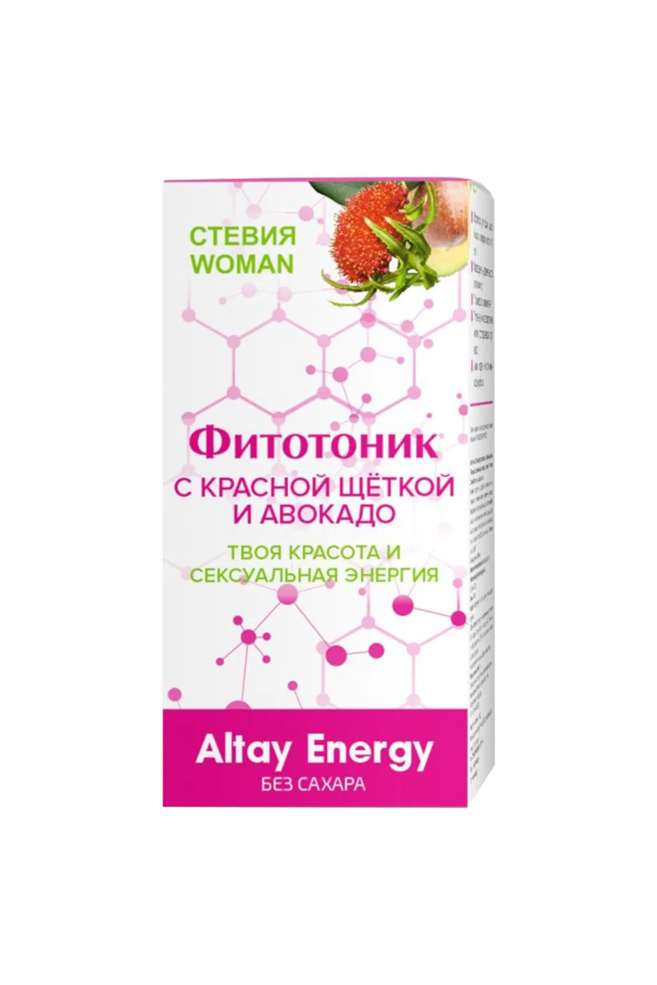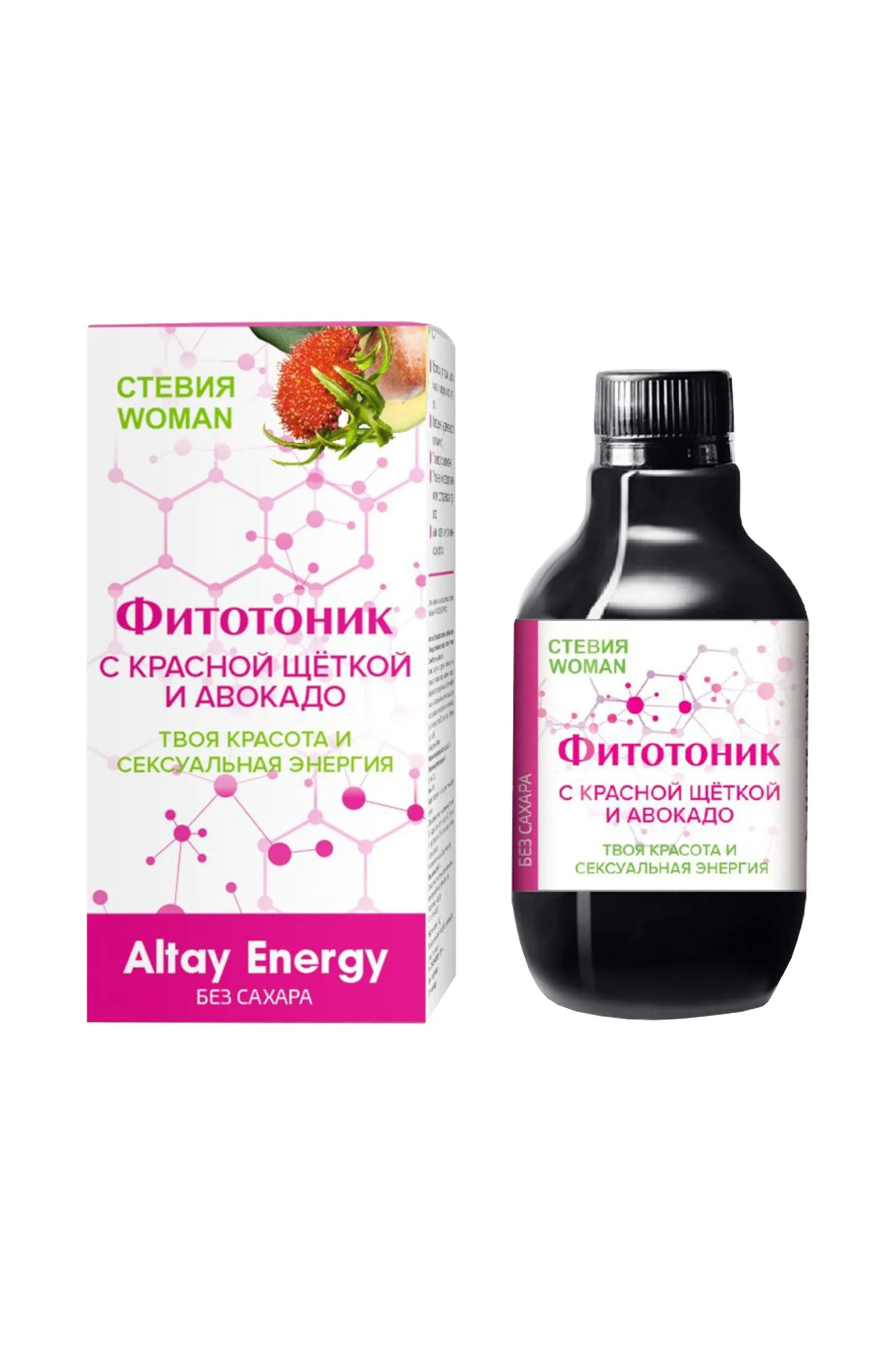 Растительный сироп “Фитотоник Стевия Woman с красной щёткой и авокадо” - женская красота и сексуальная энергия. Благодаря свойствам входящих в состав целебных трав, экстрактов, витаминов и микроэлементов, фитотоник оказывает возбуждающий эффект, помогает повысить чувствительность эрогенных зон и либидо, справиться с симптомами раздражительности и климактерических расстройств. Активные компоненты: красная щетка, эхинацея, дягиль, медуница, душица, экстракт горянки, экстракт пуэрарии мирифики, экстракт авокадо, экстракт дамианы, экстракт маки перуанской, стевия; L-аргинин, яблочный пектин, янтарная кислота, фруктоза. Красная щётка эффективно устраняет нарушения в работе эндокринной системы, нормализует гормональный фон, обладает регенерирующим и омолаживающим действием. Эхинацея повышает иммунитет, предотвращает преждевременное старение организма. Дягиль активизирует иммунную защиту, борется со стрессом, применяется для профилактики и лечения заболеваний гинекологического профиля (дисменорея, мастопатия, ПМС, бесплодие, климакс). Медуница стимулирует деятельность щитовидной железы, желёз внутренней секреции, нормализует уровень половых гормонов. Душица обладает мягким успокаивающим действием, снимает спазмы и боли, выравнивает эмоциональное состояние при климаксе. Экстракты горянки, пуэрарии мирифики, авокадо, дамианы, маки перуанской – женские афродизиаки, помогают устранить сексуальные дисфункции: снижение либидо, низкую чувствительность эрогенных зон, недостаток вагинальной секреции, фригидность. L-аргинин усиливает кровообращение в органах малого таза, положительно влияет на получение оргазма. Стевия стимулирует ферментную активность, ускоряя метаболизм, снижает уровень сахара и холестерина в крови. Янтарная кислота – антиоксидант и иммуномодулятор. Рекомендации по применению: Употреблять по 2 столовые ложки сиропа 1-2 раза в сутки до еды. Пищевая ценность на 100 г продукта: углеводы 10,0 г. Энергетическая ценность на 100 г продукта: 36,8 ккал/ 150 кДж. Продукт не содержит ГМО. Условия хранения: хранить в защищенном от прямых солнечных лучей и недоступном для детей месте, при температуре не выше 25°С и относительной влажности не более 75%. После вскрытия хранить в холодильнике не более 3 месяцев. Срок годности: 18 месяцев. Объем: 250 мл
