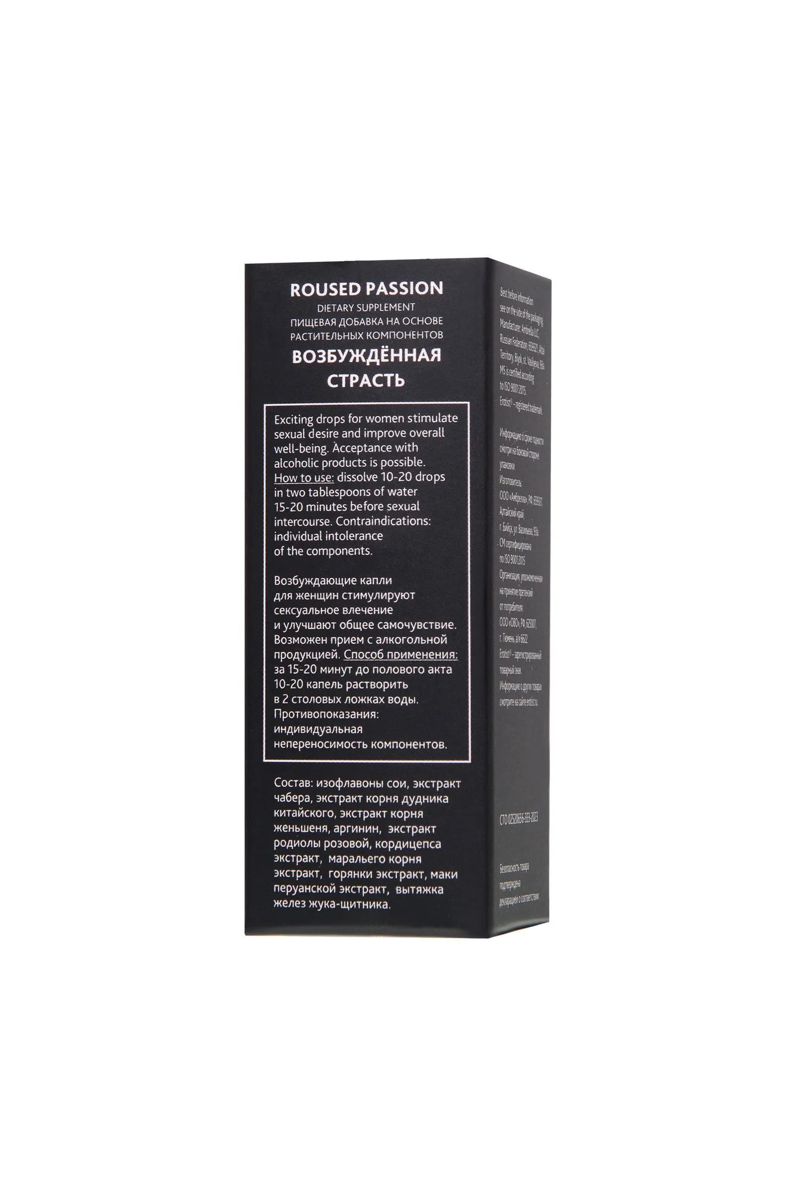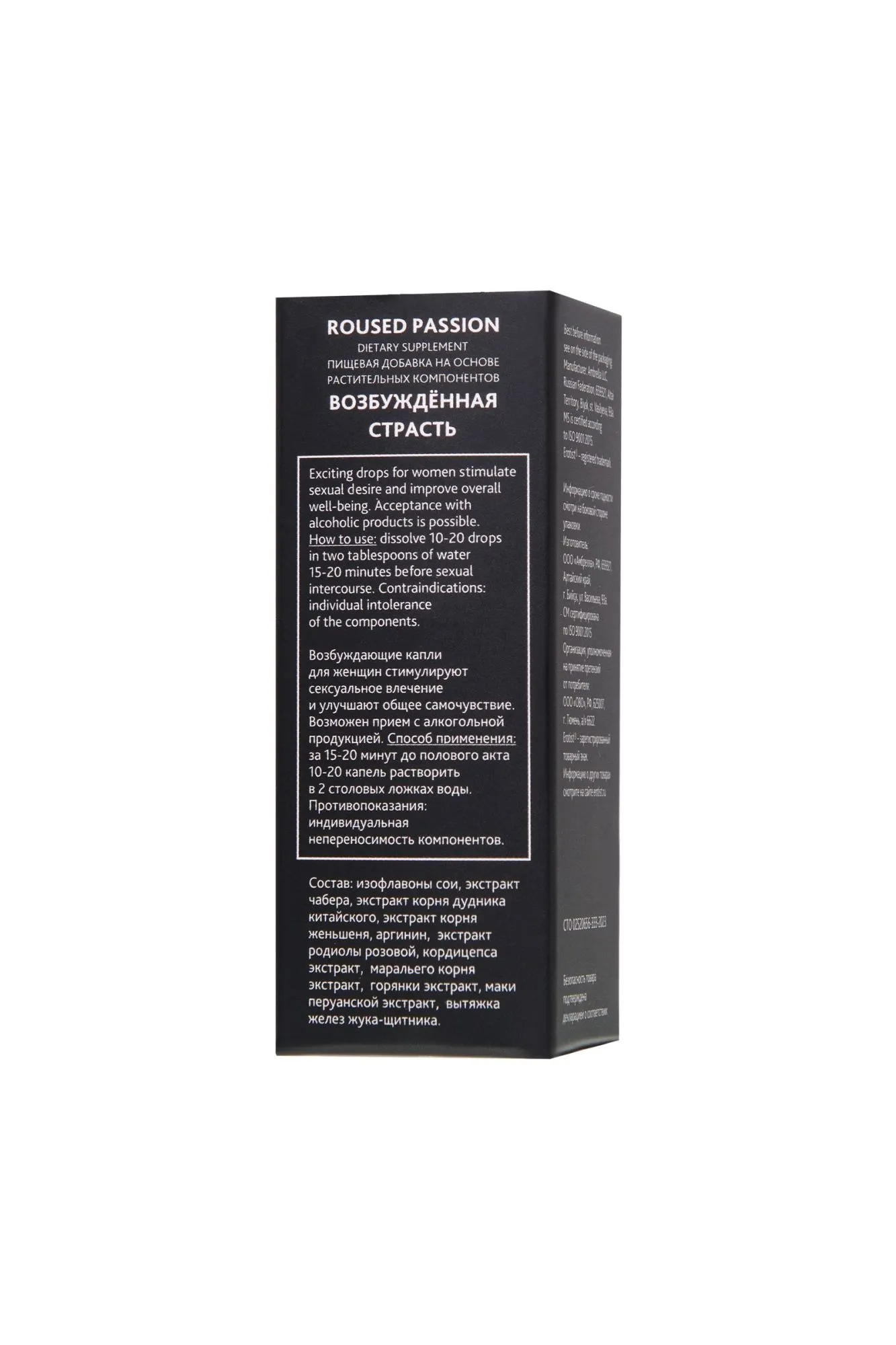 Сделайте свою сексуальную жизнь ярче и разнообразьте ее новыми ощущениями. Возбуждающие капли для женщин Roused Passion вызывают моментально нарастающее желание секса. Активные компоненты пищевой добавки на основе растительного комплекса позволяют добиться возбужденного состояния за считанные минуты. Возбуждающее действие капель уже через 15-20 минут после применения способствует: Росту сексуального влечения Снятию физиологических блоков и психологических ограничений Раскрепощенности в сексе и повышению чувствительности эрогенных зон Захватывающему удовольствию от секса Достижению максимально яркого оргазма. Усилению выработки влагалищной смазки. В состав средства входят растительные фитоэстрогены, сходные с женскими половыми гормонами, “ответственными” за повышение чувствительности эрогенных зон. Капли Roused Passion содержат компоненты, пробуждающие желание и влияющие на эмоции. При регулярном употреблении Roused Passion очевиден эффект в виде: активизации микроциркуляции крови повышения тактильной чувствительности и “настройки” на партнера расслабления и пробуждения фантазии, способствуя проявлению решительности для более смелых, чем обычно действий раскрытия чувственности и женственности восстановления сексуальной энергии и усиления влечения. Рекомендации по применению: Взрослым женщинам принимать за 15-20 минут до полового акта 10-20капель растворив в 2 столовых ложках воды. Не содержит гормонов, не вызывает привыкания. Основные действующие компоненты: Изофлавоны сои относятся к классу фитоэстрогенов, представляющих собой вещества растительного происхождения, схожие по структуре с женскими половыми гормонами и оказывающие аналогичное эстрогенам, но более деликатное действие. Влияют на вагинальный кровоток, телесную чувственность (эрогенные зоны), косметическую составляющую (состояние кожи, волос), приток крови к головному мозгу. Снабжение организма растительными эстрогенами способствует улучшению общего самочувствия, улучшает настроение, снижается риск наступления депрессии и апатии. Оказывают омолаживающее действие, улучшают эластичность, упругость и увлажненность кожи, стимулируют синтез коллагена. Экстракт чабера запускает механизм кровообращения в области малого таза, снимает напряжение, повышает либидо. Усиленный приток крови к гладкой мускулатуре половых органов обеспечивает повышенную чувствительность нервных окончаний, благодаря этому женщина испытывает сильное возбуждение. Экстракт корня дудника китайского (донг квай) используется в традиционной китайской медицине, помогает увеличить циркуляцию крови в репродуктивной системе женщины и улучшить приток крови. Благодаря его гормонально-балансирующим, бодрящим и возбуждающим свойствам, оказывает действие направленное на повышение либидо, стимулирует выработку естественной смазки, и за счет усиления возбуждения, повышает чувствительность и сексуальное желание. Женьшеня корень известен как отличный стимулятор либидо, оказывающий воздействие на органы эндокринной системы, пробуждает сексуальное желание и значительно усиливает ощущения наслаждения. Аргинин – незаменимая аминокислота, которая увеличивает уровень окиси азота в теле человека. Способствует улучшению сексуальной функции. Обеспечивает нормальный уровень артериальн