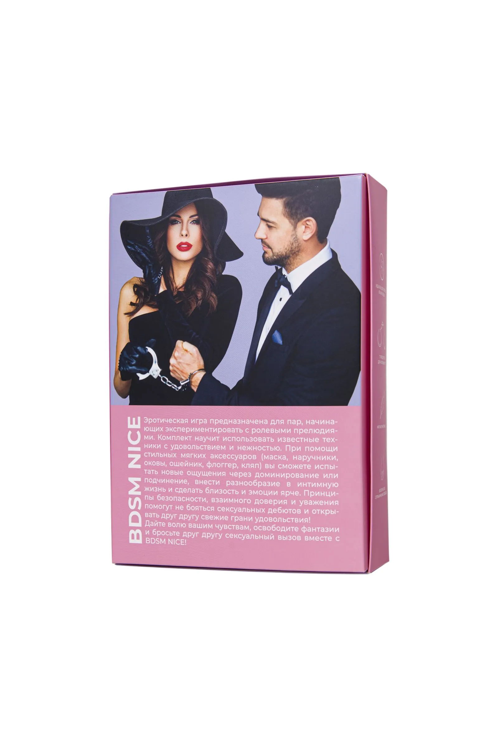 Эротическая игра предназначена для пар, начинающих экспериментировать с ролевыми прелюдиями. Комплект научит использовать известные техники с удовольствием и нежностью. При помощи стильных мягких аксессуаров (маска, наручники, оковы, ошейник, флоггер, кляп) вы сможете испытать новые ощущения через доминирование или подчинение, внести разнообразие в интимную жизнь и сделать близость и эмоции ярче. Принципы безопасности, взаимного доверия и уважения помогут не бояться сексуальных дебютов и открывать друг другу свежие грани удовольствия! Дайте волю вашим чувствам, освободите фантазии и бросьте друг другу сексуальный вызов вместе с BDSM NICE!