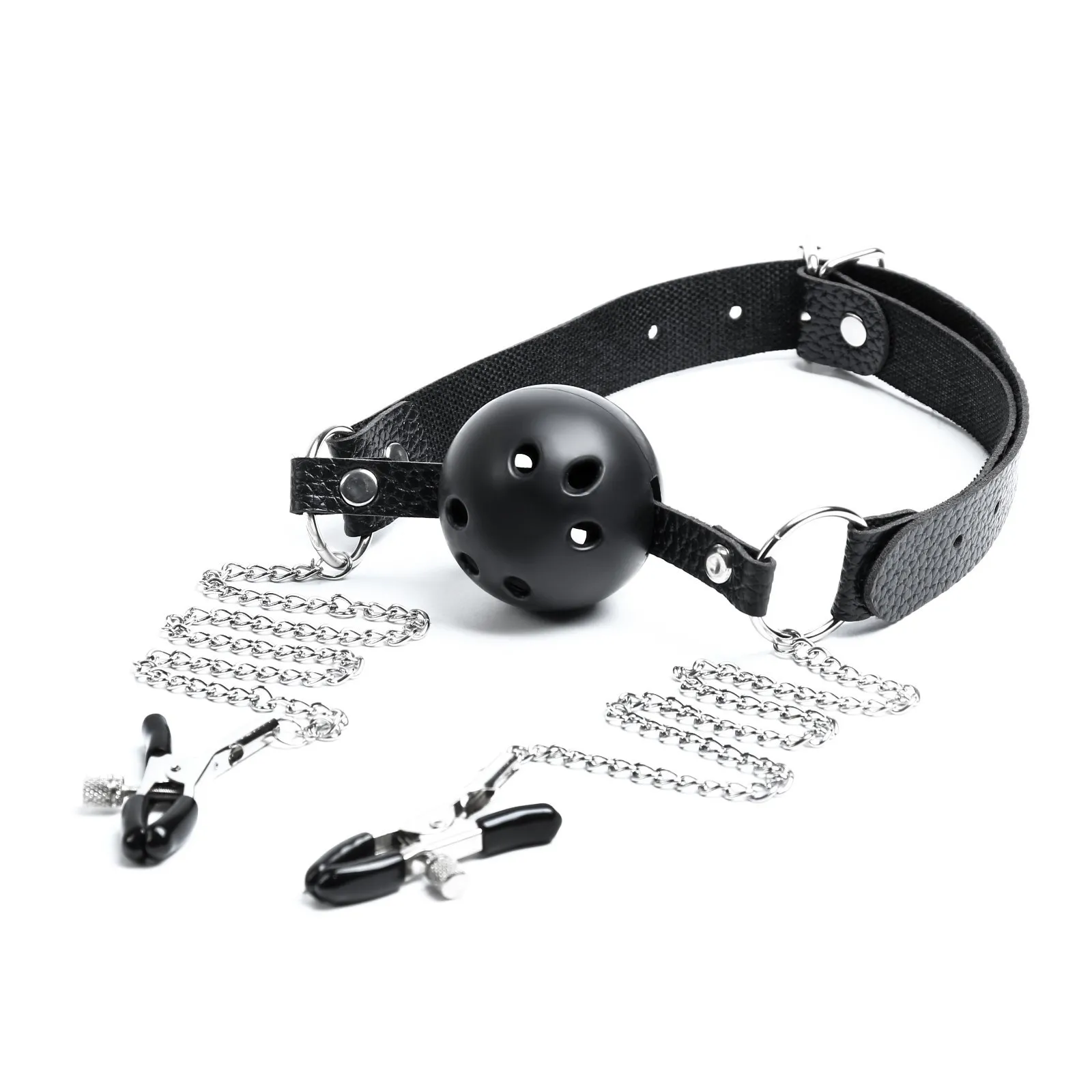 Кляп с зажимами для сосков. Выполнен из эко-кожи и abs пластика. Шарик имеет оптимальный размер, хорошо помещается в рот, а ремешок имеет систему регулировки, так что он подойдет и для нее и для него. Имеет длинную цепь и зажимы. Перед использованием необходимо помыть игрушку под проточной водой, далее обработать специальным спреем - клинером.