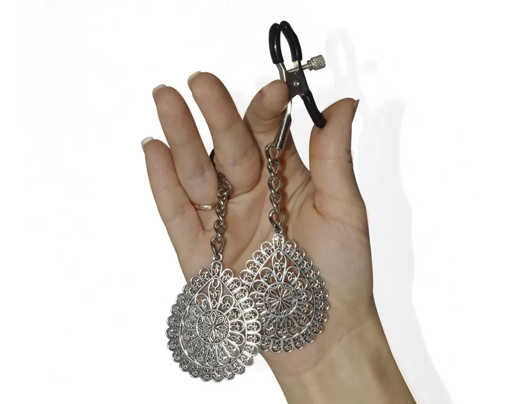 Зажимы оснащены пружинным механизмом, за счет чего легко и удобно фиксируются на месте, винтики позволяют отрегулировать степень давления в соответствии с индивидуальными предпочтениями. Размер металлической подвески 5 см*5 см. Длина цепочки 3 см.