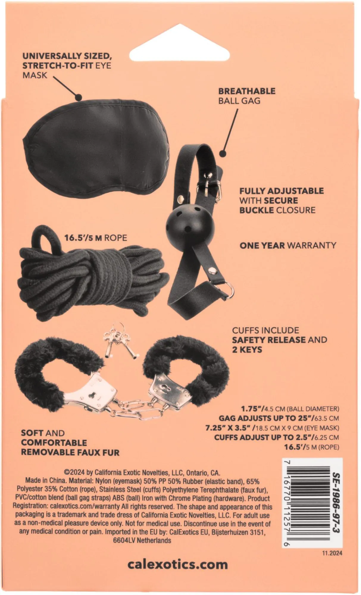 Эта коллекция — сокровищница для любопытных, включающая дышащий кляп-шар с полностью регулируемой пряжкой, маску для глаз, которая растягивается по размеру, съемные манжеты из искусственного меха и 5 метров веревки. Независимо от того, являетесь ли вы опытным энтузиастом или новичком в игре, этот набор создан, чтобы открыть новые сферы удовольствия.