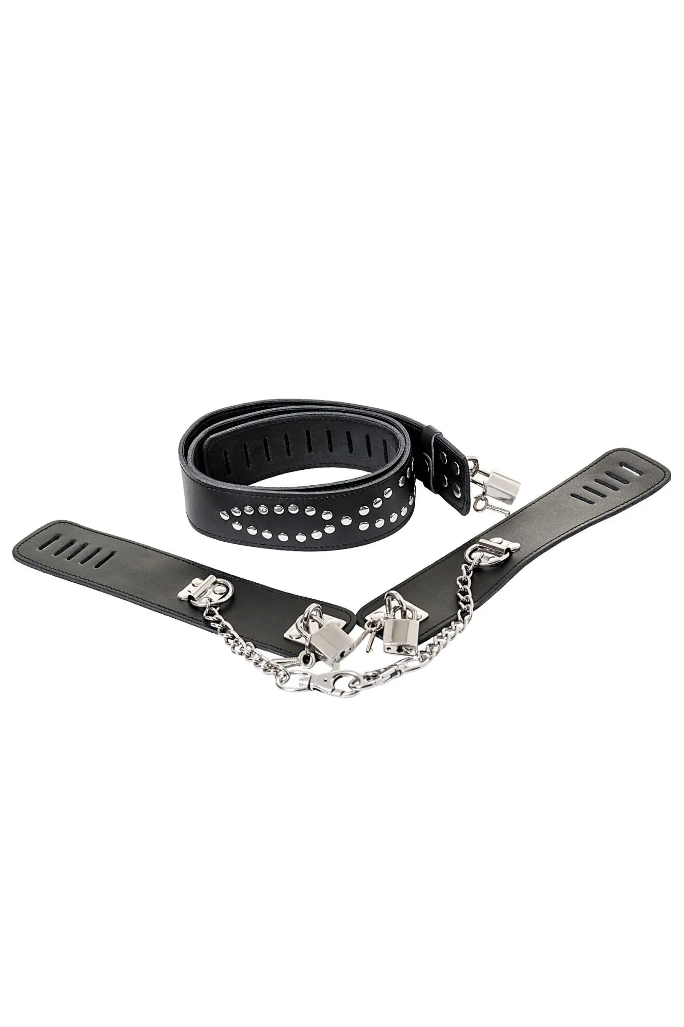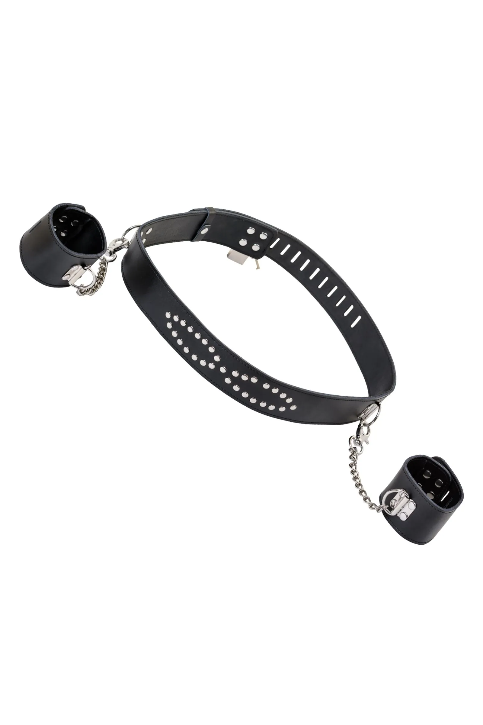 Этот бондажный набор станет превосходным дополнением к играм с фиксацией партнёра. Ведь он обладает для этого всеми необходимыми качествами: • сковывает руки на 15-сантиметровом расстоянии от талии; • не натирает благодаря тому, что изготовлен из мягкой кожи; • подходит к различным игровым сценариям, поскольку выполнен в классическом стиле. С данным набором интимные игры становятся ярче, а впечатления от секса мощнее!