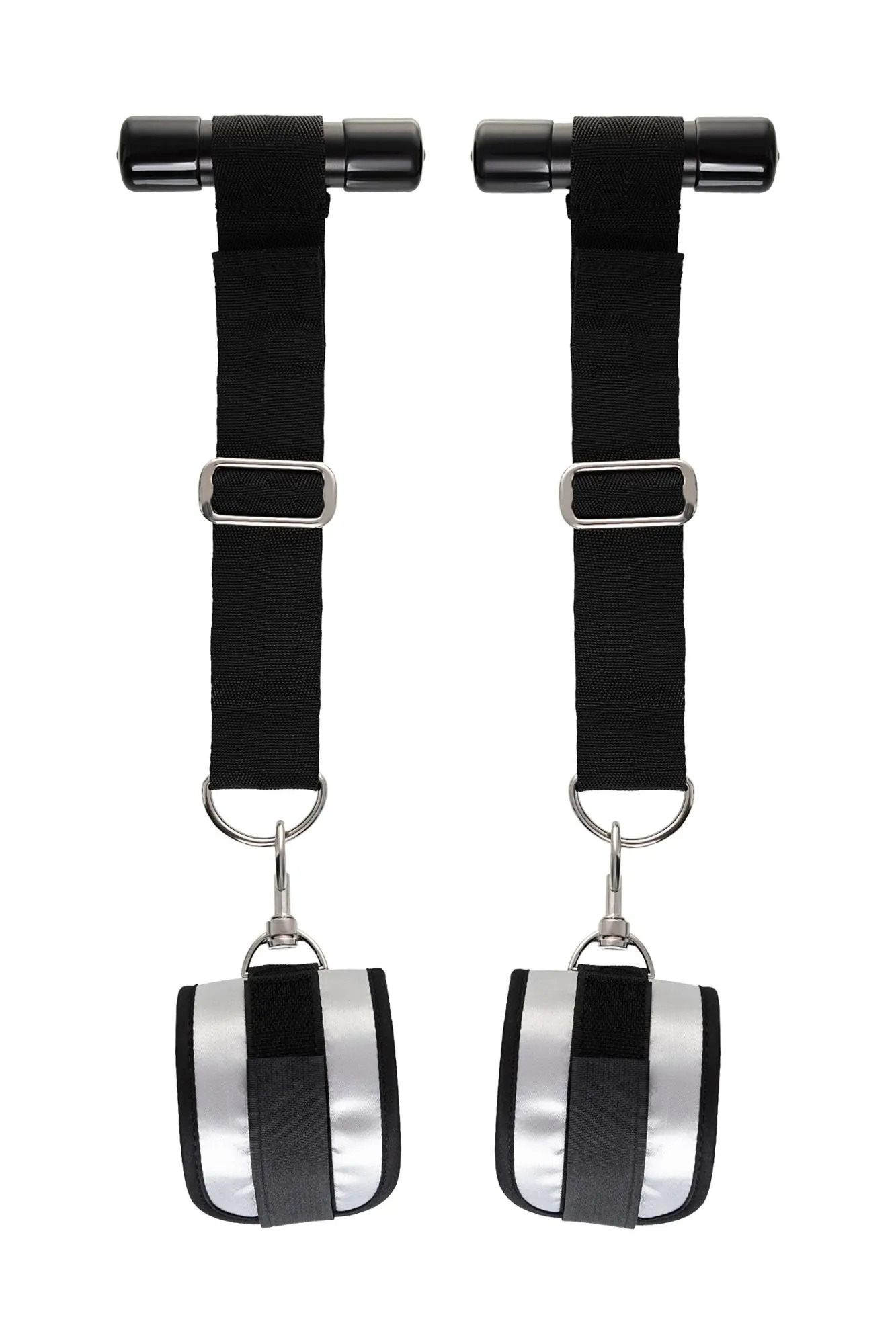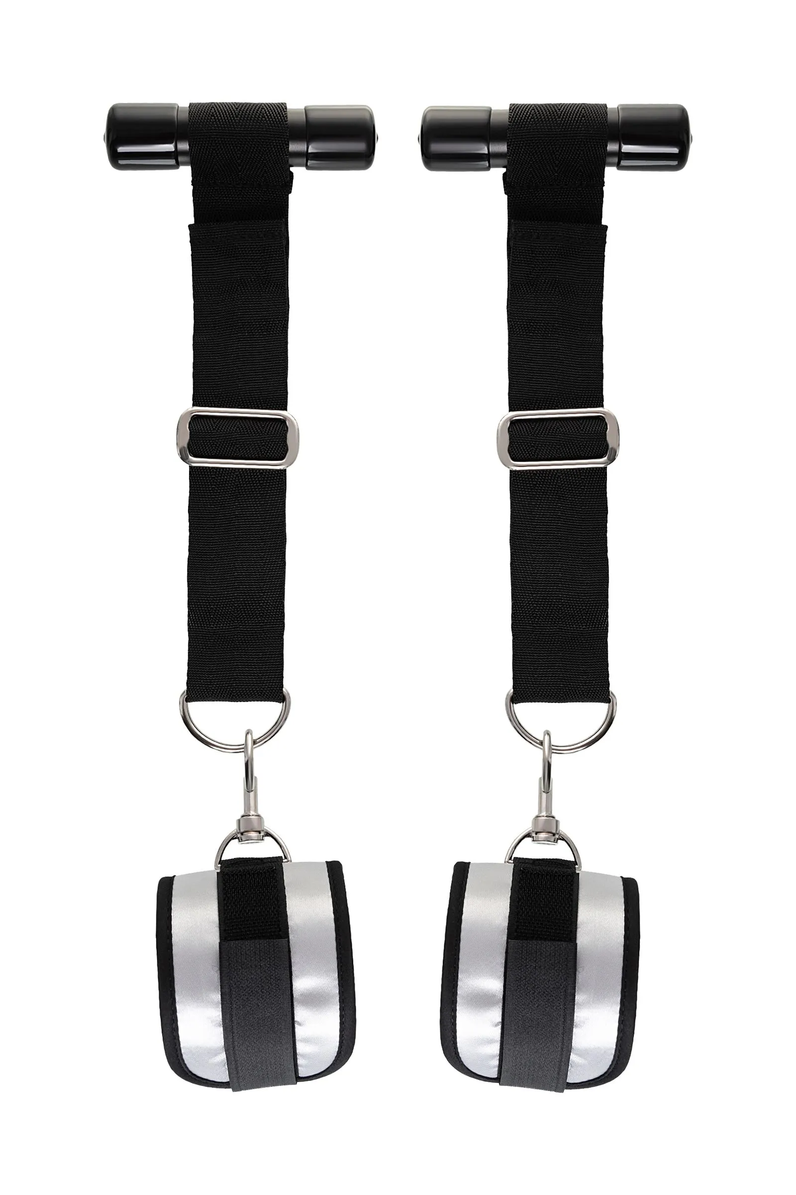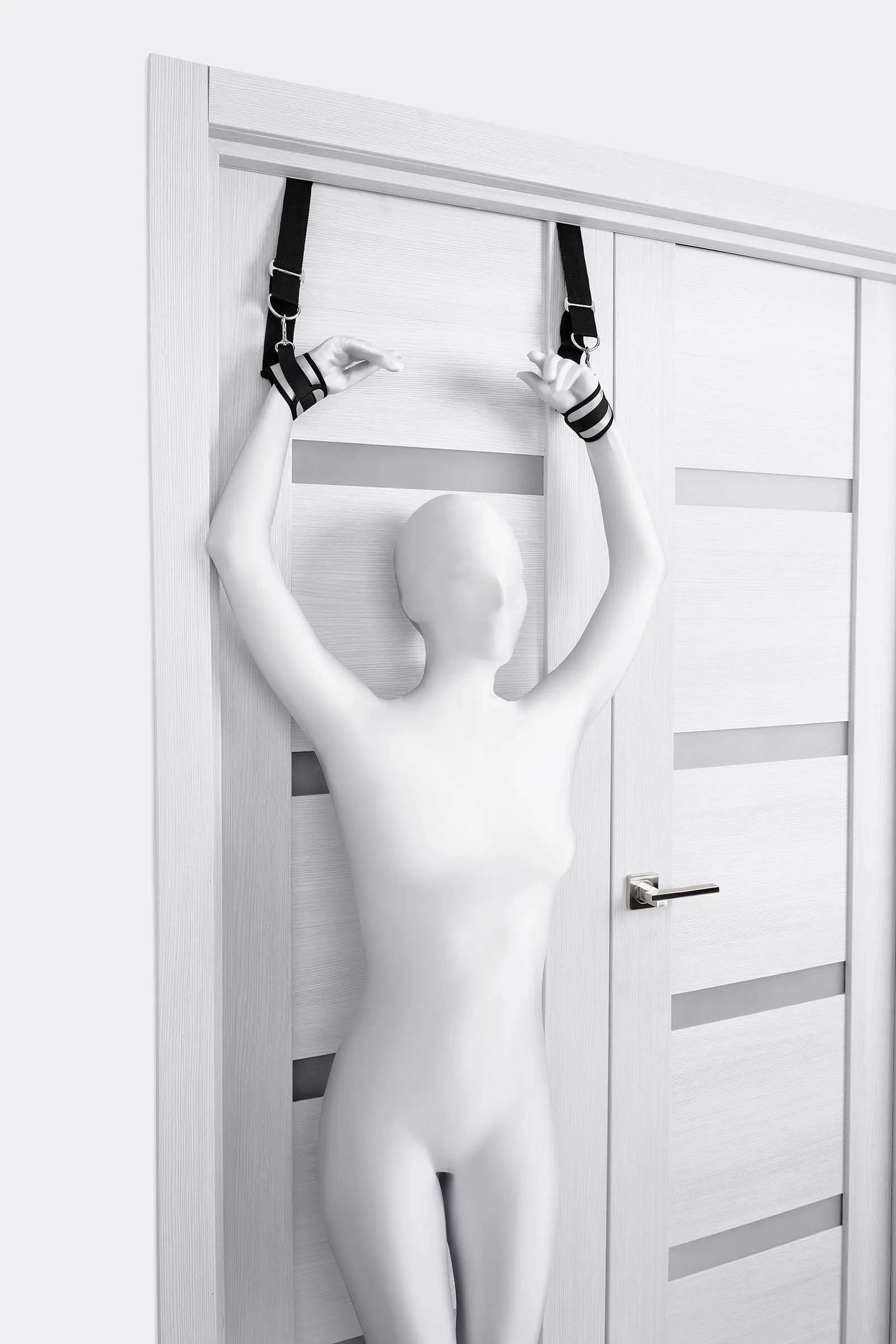 Оставьте наручники и кровать в прошлом веке, пора играть по-взрослому. Фиксаторы для рук на дверь для смелых и терпеливых. Больше позиций для получения удовольствия без силовых затрат! Пластиковые цилиндры фиксируются за дверью, наручники крепятся на запястьях с помощью застежки велкро. Размер легко регулируется ремешками и подойдет для запястий любого размера. Серебряный цвет с черными ремешками смотрится элегантно. Внутренняя часть наручников мягкая и не доставляет дискомфорта во время использования. Фиксаторы с помощью двери дают вам больше свободы для реализации фантазий. Не нужно напрягаться, чтобы удерживать руки вверху, не нужно контролировать своего партнера, если хочется удержать его стоя. Эта оригинальная форма бандажа выведет вас на новый уровень наслаждения с доверием. Материал: полиэстер, полипропилен, ABS-пластик Общая длина наручников: 23 см Длина ремней: 26 см Ширина наручников: 7 см Диаметр цилиндра: 2,5 см