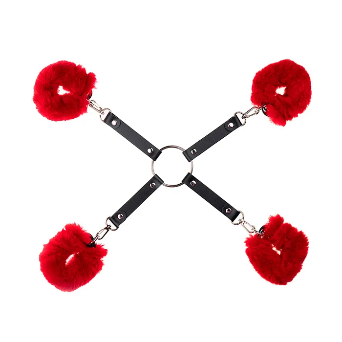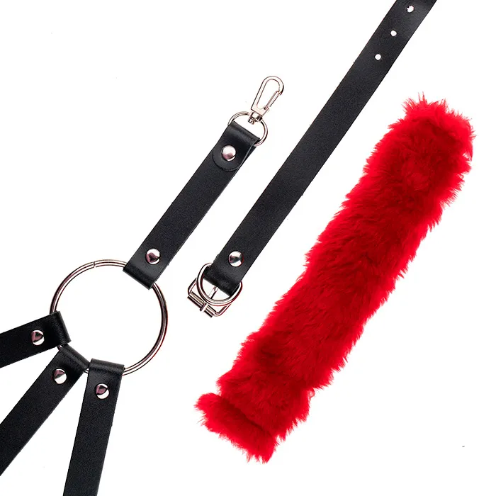 Набор для фиксации с четверным креплением, кольцом в центре и карабинами на концах. Чёрная натуральная кожа и красный съемный искусственный мех.