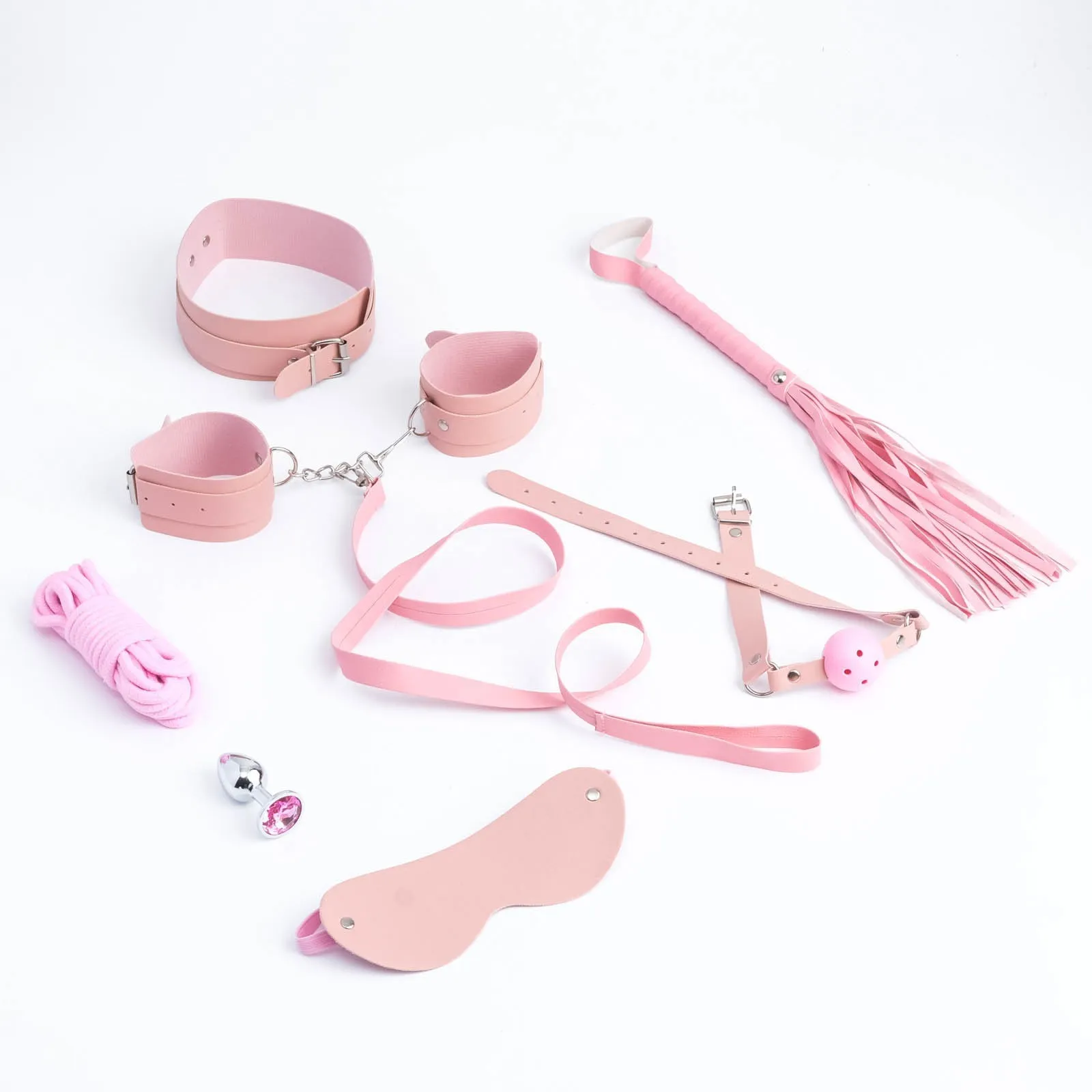 БДСМ набор выполнен из эко-кожи. Все ремни имеют систему регулировки. В состав набора входят 8 предметов: наручники, кляп, ошейник, поводок, верёвка,маска, анальная пробка, плеть.