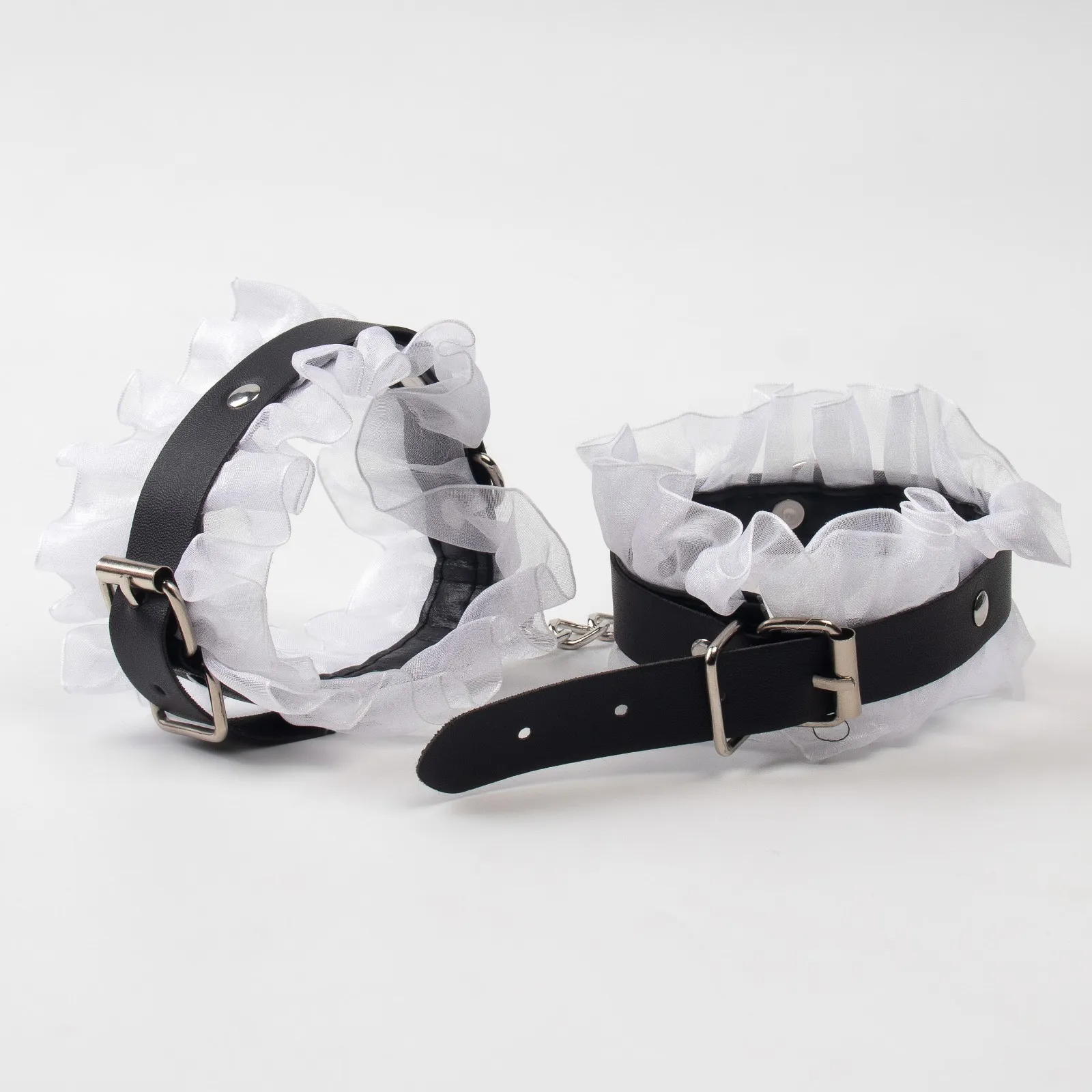 БДСМ набор выполнен из эко-кожи с кружевом - контраст нежности и грубости. Все ремни имеют систему регулировки. В состав набора входят 9 предметов: наручники, оковы, кляп, ошейник, поводок, верёвка, маска, зажимы для сосков, плеть.