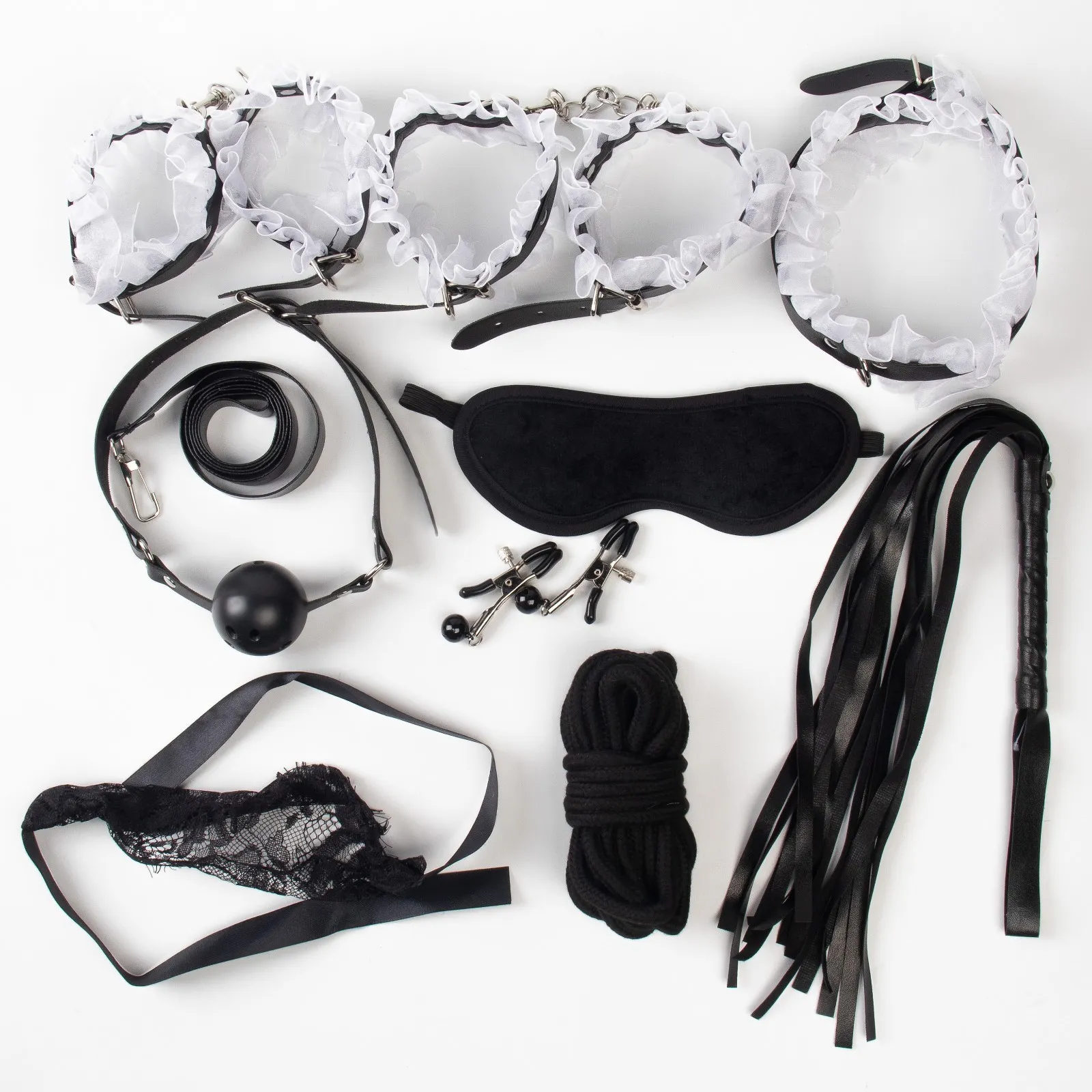 Кляп выполнен из эко-кожи и abs пластика. Шарик имеет оптимальный размер, хорошо помещается в рот, а ремешок имеет систему регулировки, так что он подойдет и для нее, и для него. Поводок крепится к ошейнику при помощи карабина, имеет длину 103 см. Хлопковая верёвка для связывания 5 м. Плеть выполнена из эко-кожи. Зажимы для сосков с колокольчиками регулируются, что обеспечит комфортное ношение.