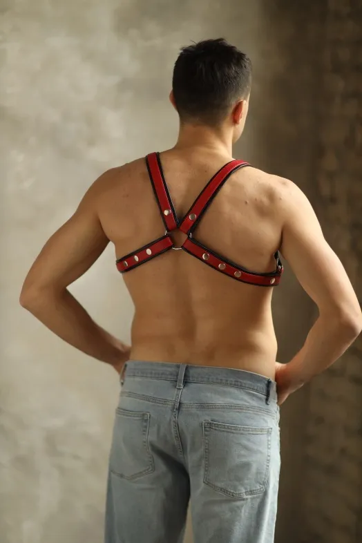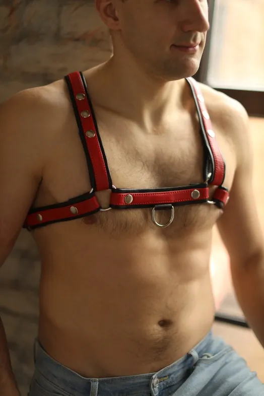Яркая и стильная, очень качественная мужская портупея, поностью выполненная из натуральной кожи. Лицевая часть выполнена из красной кожи, а подклад - из черной, очень мягкой и приятной к телу. Фиксация происходит с помощью кнопок, что позволяет легко и удобно регулировать посадку аксессуара по фигуре. Портупея декорирована надежными сварными металлическими кольцами, к которым можно при желании пристегивать дополнительные аксессуары и комбинировать в разных вариантах. Портупея двустороняя: ее можно носить по разному, меняя положение, а еще она отлично сочетается с мужскими трусами из нашей коллекции Boy's Arsenal. Создайте неповторимый мужской образ, который подойдет как для тематической вечеринки, так и для эротической игры!