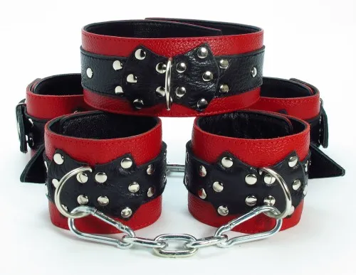 Набор аксессуаров, изготовленных из натуральной кожи. В него входят: наручи и поножи, украшенные заклепками (ширина - 6 см), которые можно соединять и комбинировать между собой при попощи цепей с карабтинами (входят в комплект) Размер меняется при помощи застежки. Так же имеется черно-красный ошейник, шириной 5 см, с одним кольцом. Размер регулируется застежками.
