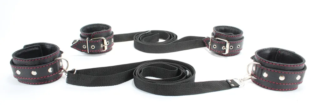 Идеальный бондажный набор для игр со связыванием в постели. Не нужно долго подготавливаться к ролевой игре, связывать веревки, затягивать их вокруг кровати и выдумывать сложные узлы. Секс-игрушка предусмотрела все за Вас. Бондажный набор состоит из нескольких комплектующих: две пары оков и и 2 ремнями на карабине, при помощи которых легко зафиксировать Вашу "жертву". Секс-игрушка откроет для Вас целый мир сексуальных утех с привязыванием и подчинением. Материал изготовления: кожа. Ширина оков - 5,2 см, длина - 24,5 см.