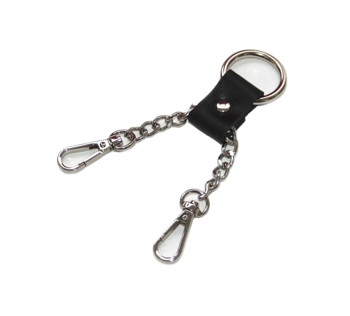 Стяжка на кольце с цепочкой выполнена из металла и натуральной кожи черного цвета. Натуральная кожа толщиной 2.3 мм. Длина цепочки с карабинами: 15 см. Диаметр кольца: 3 см.