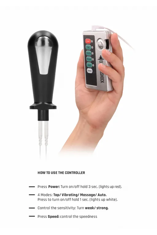 В комплекте с игрушкой идет блок питания, обеспечивающий разнообразную стимуляцию, что позволяет выбрать богатейший спектр ощущений и воздействий, от лёгкого шевеления мышц до судорог мощнейшей стимуляции. Просто вставьте пробку и выберете соответствующую настройку на блоке. Для мио стимуляции необходимо, чтобы обе стальные детали одновременно касались тела.