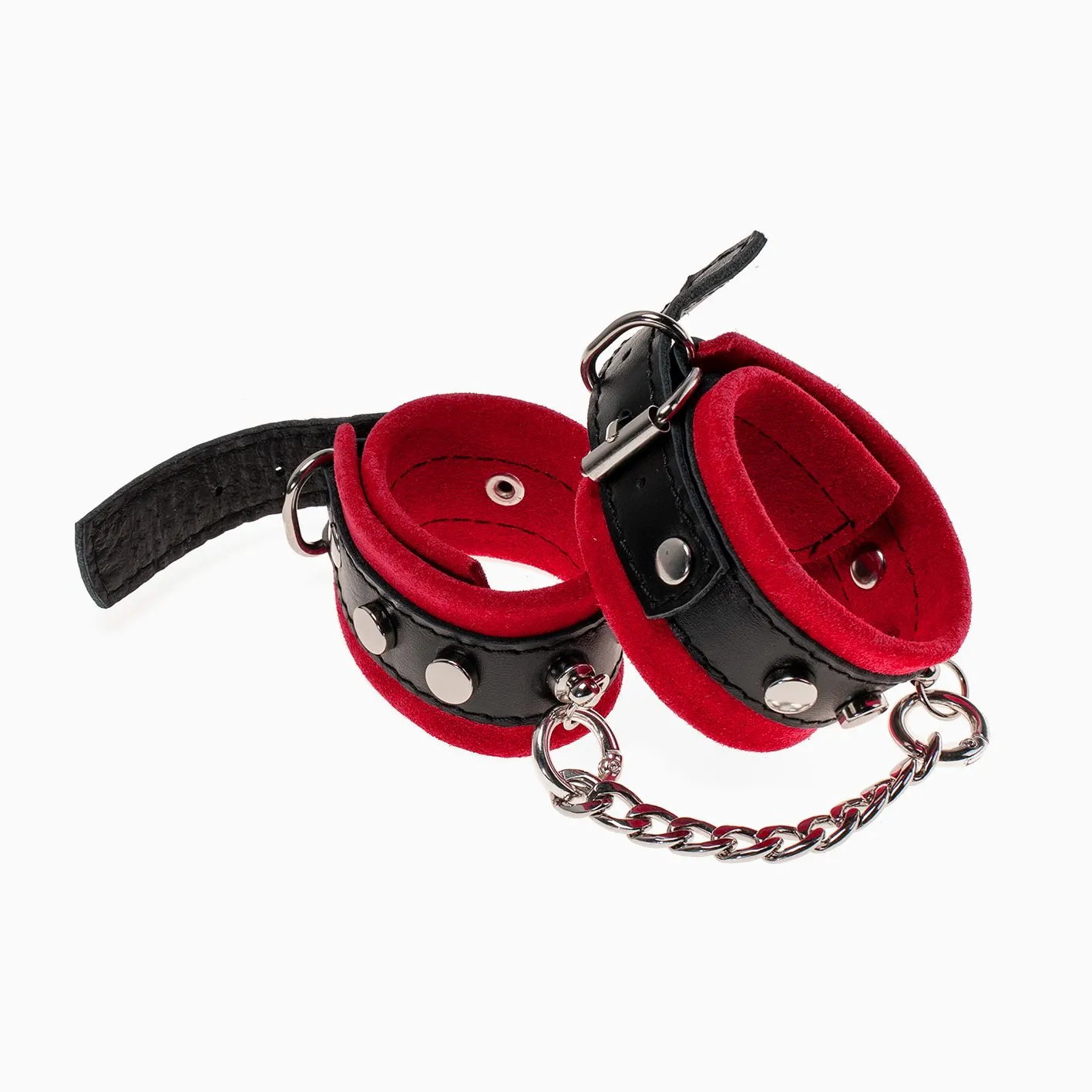 Наручники сделаны из замши и соединены между собой металлической цепочкой на карабинах. Наручники регулируются по размеру ремешками с пряжками.