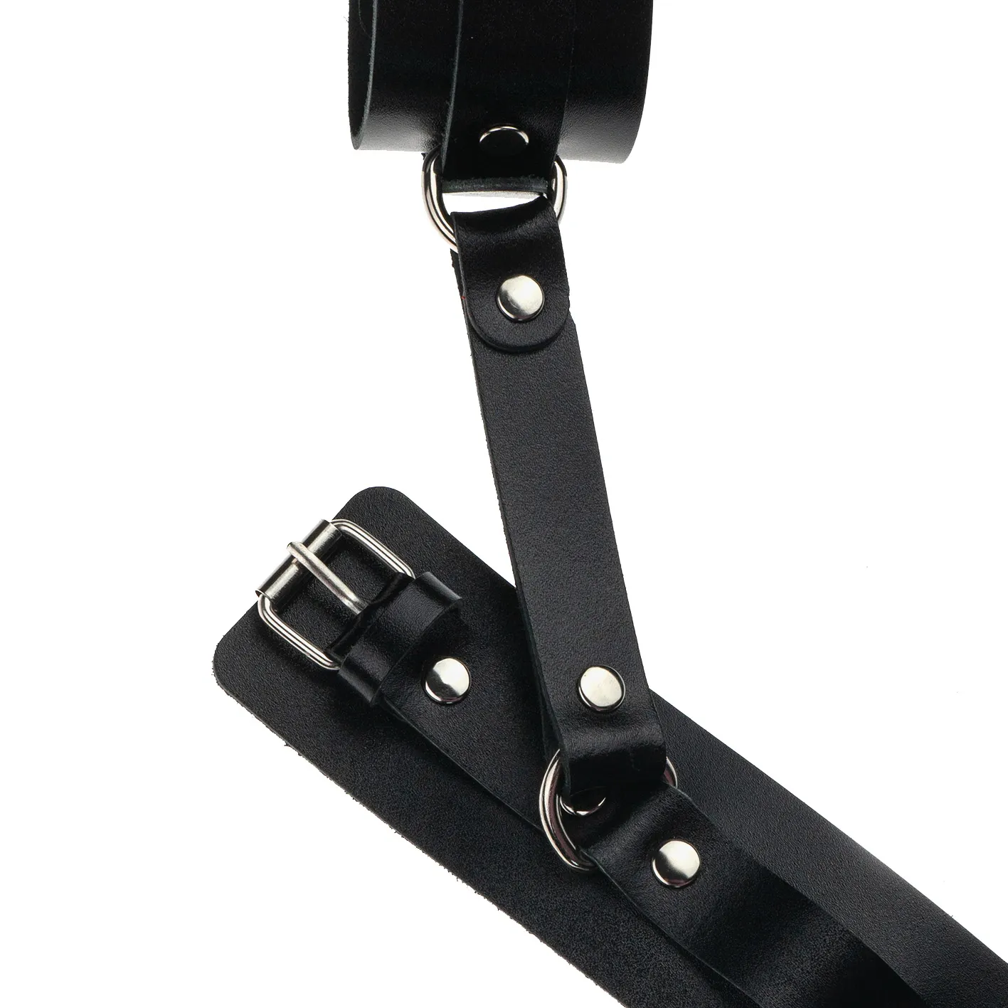 Теперь Доминант покажет, что значит грубое обращение и полный контроль над свободой. Чёрные наручники с металлической отделкой на самом деле твёрдо обхватывают руки и надежно соединяют их между собой коротким кожаным ремешком на карабинах. Предусмотрено место для крепления дополнительных аксессуаров. Можно придумывать разные варианты фиксации.