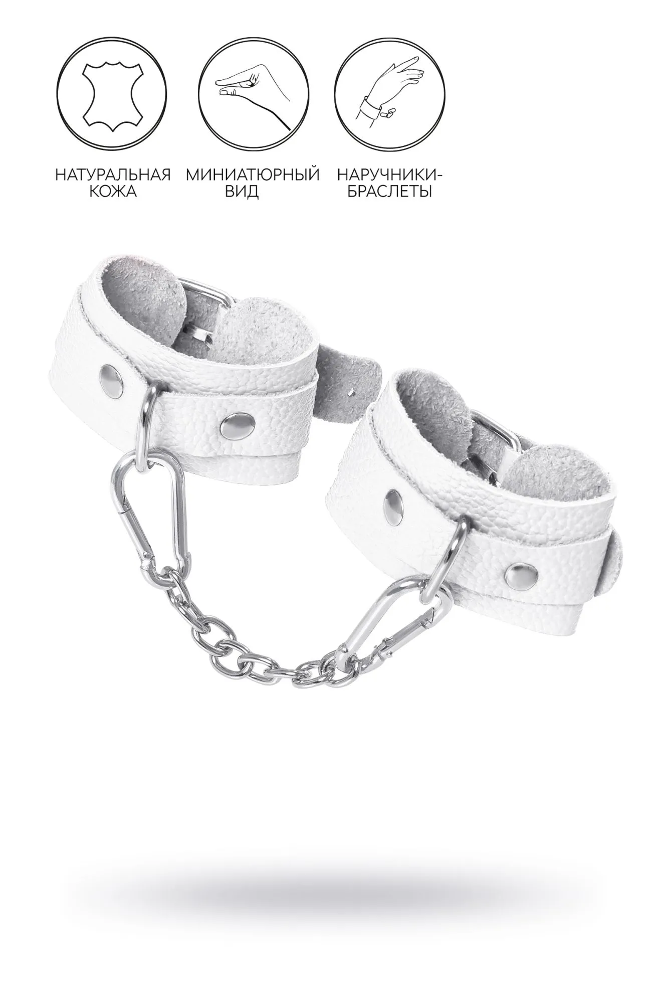 Ищите наручники для миниатюрной ручки? Тогда обратите внимание на эту модель от российского производителя Pecado. Они идеально созданы для обладательниц узкого запястья. Каждый элемент аксессуара изготовлен полностью вручную. Мягкий, белый материал нежно обхватывает руку и оставляет только приятные ощущения от контакта с телом. Аксессуар декорирован качественной фурнитурой, благодаря которой, при необходимости, его легко снять. Соединяются между собой с помощью короткой стальной цепочки и двух колец с карабинами. При правильном использовании не оставляют следов на теле. А особый аромат натуральной кожи придает пикантности сексуальному атрибуту. Подходит как для начинающих пар, так и для ценителей БДСМ-игр. Погрузитесь в мир пикантных удовольствий! Вместе с Pecado. ● 100% натуральная кожа. ● Ручная работа. ● Износостойкий, тактильно приятный материал. ● Надежная высококачественная фурнитура. ● Универсальный размер. ● Длина манжет – 15 см, ширина манжет – 4 см, длина сцепки – 14 см.