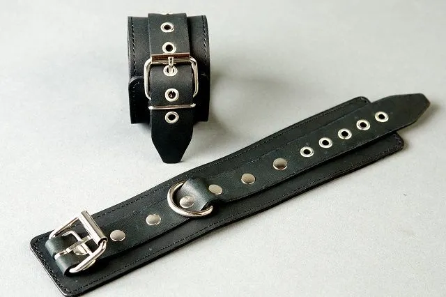 Наручники сделаны из натуральной кожи с металлической фурнитурой. Посередине каждого наруча есть специальное кольцо, к которому можно прикреплять различные бондажные системы. Наручники не нарушают кровообращение, а их размер регулируется при помощи ремня с пряжкой. Максимальный обхват - 24 см, минимальный - 18 см.
