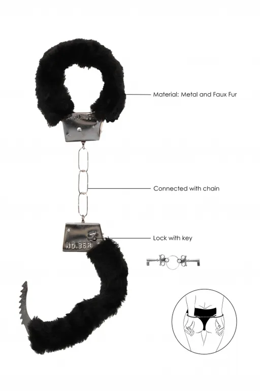 Наручники Beginner's Handcuffs Furry - специализированное приспособление для надежной фиксации и обездвиживания партнера при эротических ролевых играх и практиках БДСМ. Классические металлические наручники с меховой обивкой могут открываться как при помощи ключей, входящих в комплект, так и с помощью механизма непосредственно на них. Кольца соединены между собой короткой неэластичной сцепкой.