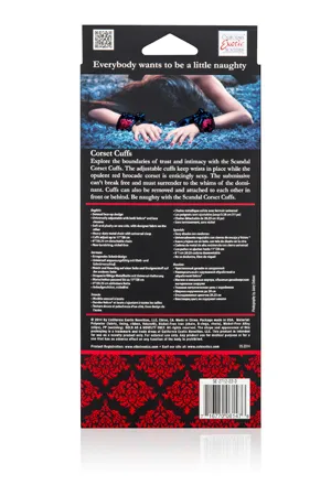 Наручники Scandal Corset Cuffs на завязках - изысканная жесткость. Мягкие и плюшевые с одной стороны, дизайнерская ткань с чувственной росписью с другой стороны, очаровательная шнуровка и тяжёлая металлическая цепь с универсальным зажимом. Эстетика и красота в каждой детали. Комфорт и безопасность во время игры. Размер: Съёмная цепь - 20,25 см, манжеты регулируются до 28 см. Материал: Полиэстер, Никель. Цвет: Красный, чёрный. Производитель: California Exotic Novelties, США.
