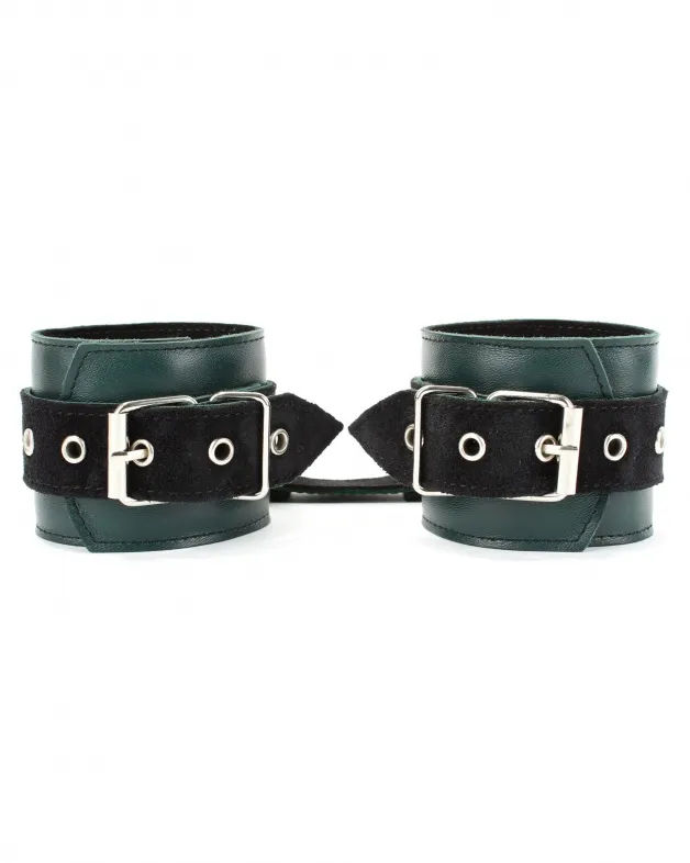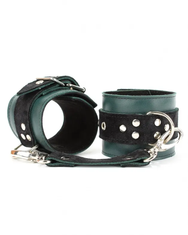 Наручники выполнены из натуральной кожи изумрудного цвета. Изделие декорировано ремнями из замши черного цвета. Посредине наручника расположено полукольцо из сварной фурнитуры. Наручники надежно фиксируются пряжками и ремнями, позволяющими выбрать нужный размер, кожаное соединение на карабинах фиксирует наручники вместе. Стильные наручники отлично подходят для воплощения эротических БДСМ игр.