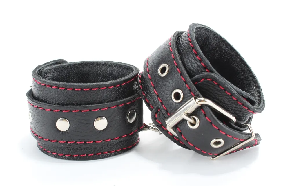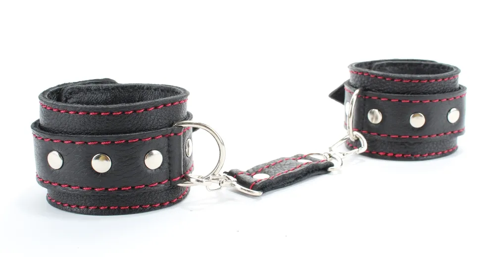 Оживить эротические игры Вам помогут наручники. Этот интимный аксессуар пользуется успехом. Выполненные в черном цвете с красной строчкой и декорированы заклепками. Модный интимный аксессуар не сдавливает и не нарушает кровообращение, так как изготовлен из мягкой кожи. Чтобы любимая никуда не убежала, наручнки соединены короткой перемычкой. Ширина оков - 5,см, длина оков- 25 см, длина перемычки – 6 см. Упаковка: картонная подложка.