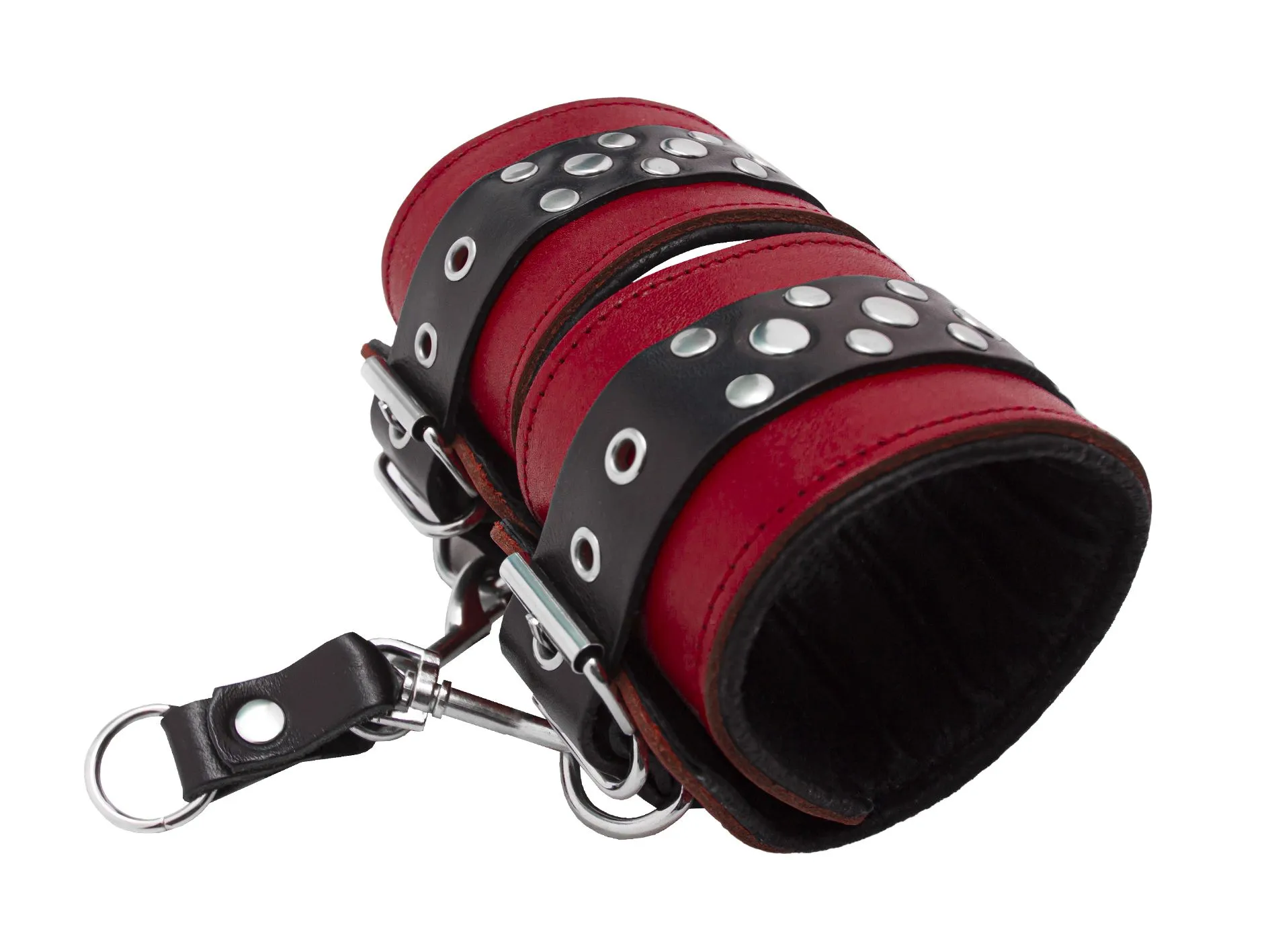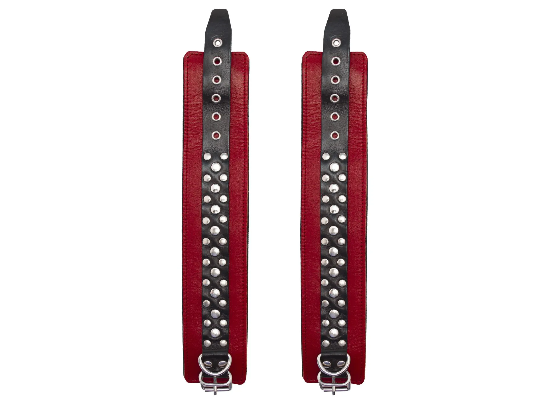 Данный девайс изготовлен из лаковой натуральной кожи, поножи украшены геометрическим рисунком из двух видов заклепок. Поножи фиксируются при помощи ремешка с пряжкой. D - образные кольца позволяют присоединять различные бандажные системы (карабины, ленты, веревки). Подкладка обеспечивает комфортное использование и безопасность.
