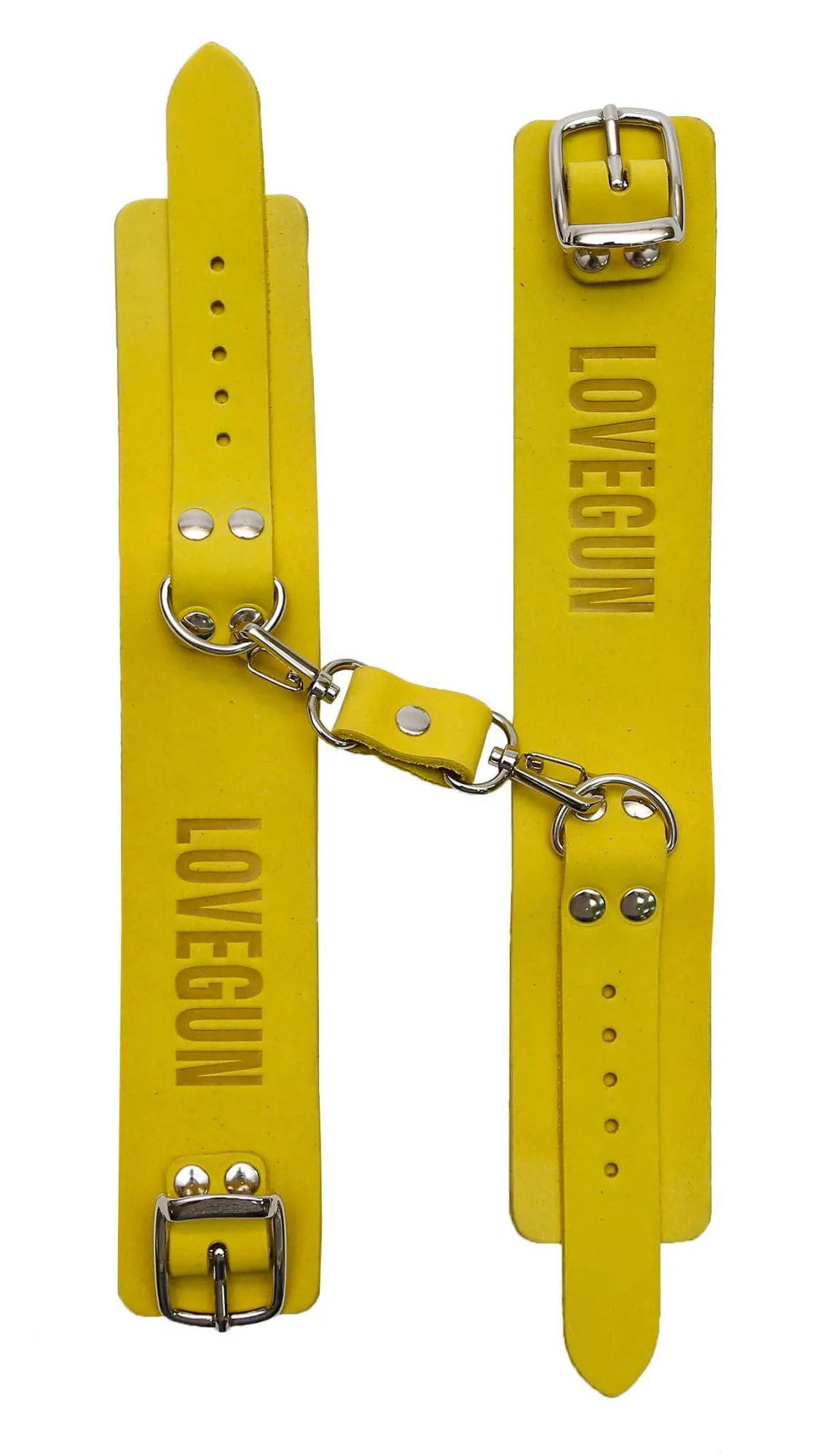 Эти кожаные наручники – эксклюзивная модель в нашем магазине. Между собой кольца, ширина которых составляет 4 см, соединены с помощью металлических карабинов. Данный девайс не имеет подкладки, но, несмотря на это, он очень удобен в использовании, и во время применения таких оков исключен любой дискомфорт. Регулировать диаметр колец можно с помощью ремешков. Эти наручники отлично разнообразят интимные отношения, а также подойдут для БДСМ-развлечений.