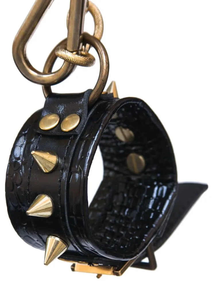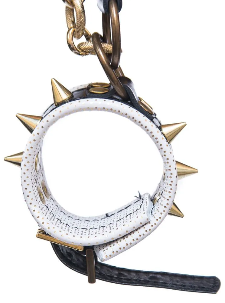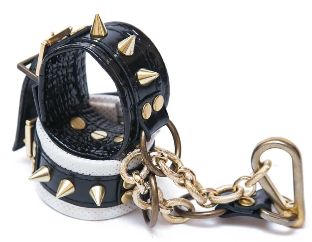 Черно-белые наручники от компании Индиго сделаны из кожи и соединены между собой металлической цепочкой и карабином. Наручники декорированы шипами и клепками, к тому же все металлические детали имеют золотистый цвет. Наручники легко регулируются. С помощью таких стильных наручников Вы можете привнести разнообразие и остроту в Ваши отношения.