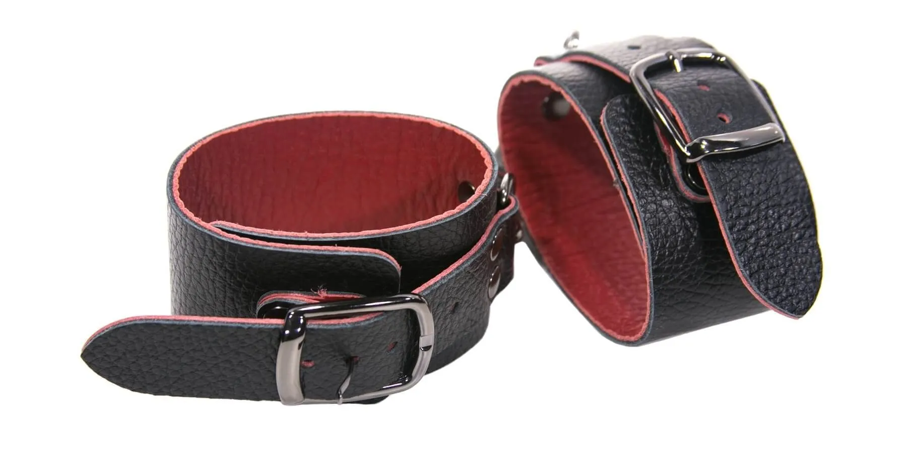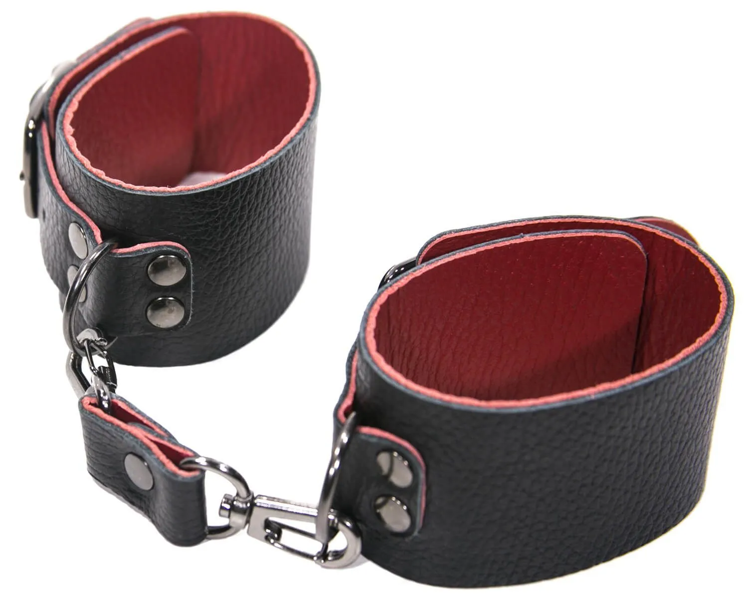 Эти черно-красные кожаные наручники от бренда Lovegun эксклюзивная модель. Ширина наручников составляет 5 см, они соединены между собой с помощью металлических карабинов. Данный девайс не имеет подкладки, но, несмотря на это, он очень удобен в использовании, и во время применения таких оков исключен любой дискомфорт. Регулировать диаметр можно с помощью ремешков. Эти наручники отлично разнообразят интимные отношения, а также подойдут для БДСМ-развлечений.
