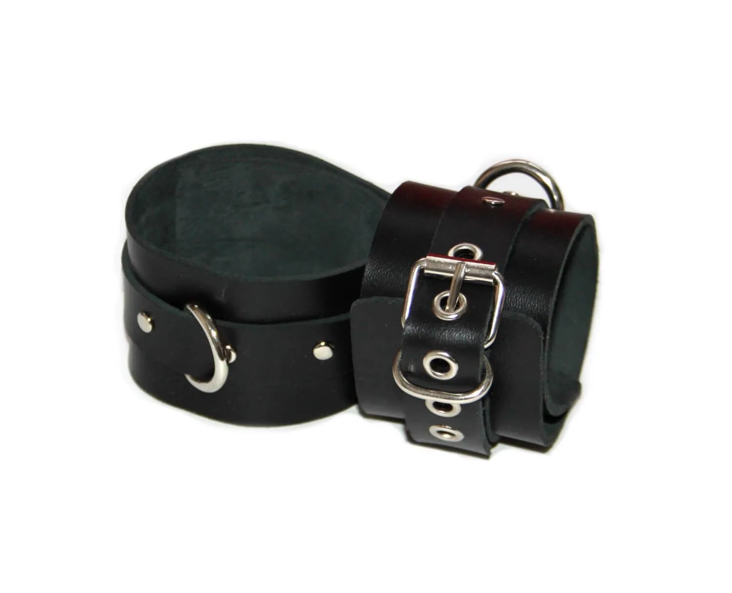 Наручи выполнены из натуральной кожи черного цвета и ничем между собой не соединены. Их можно использовать как сексуальное и дерзкое украшение, которое дополнит Ваш ролевой эротический костюм. Или же можно соединить их при помощи цепи или карабина, чтобы они смогли зафиксировать руки Вашего партнера. Невозможность двигать руками обострит все чувства партнера, делая его особенно чувствительным ко всем прикосновениям. Наручи разнообразят Ваши интимные игры и позволят испытать новые ощущения во время секса.