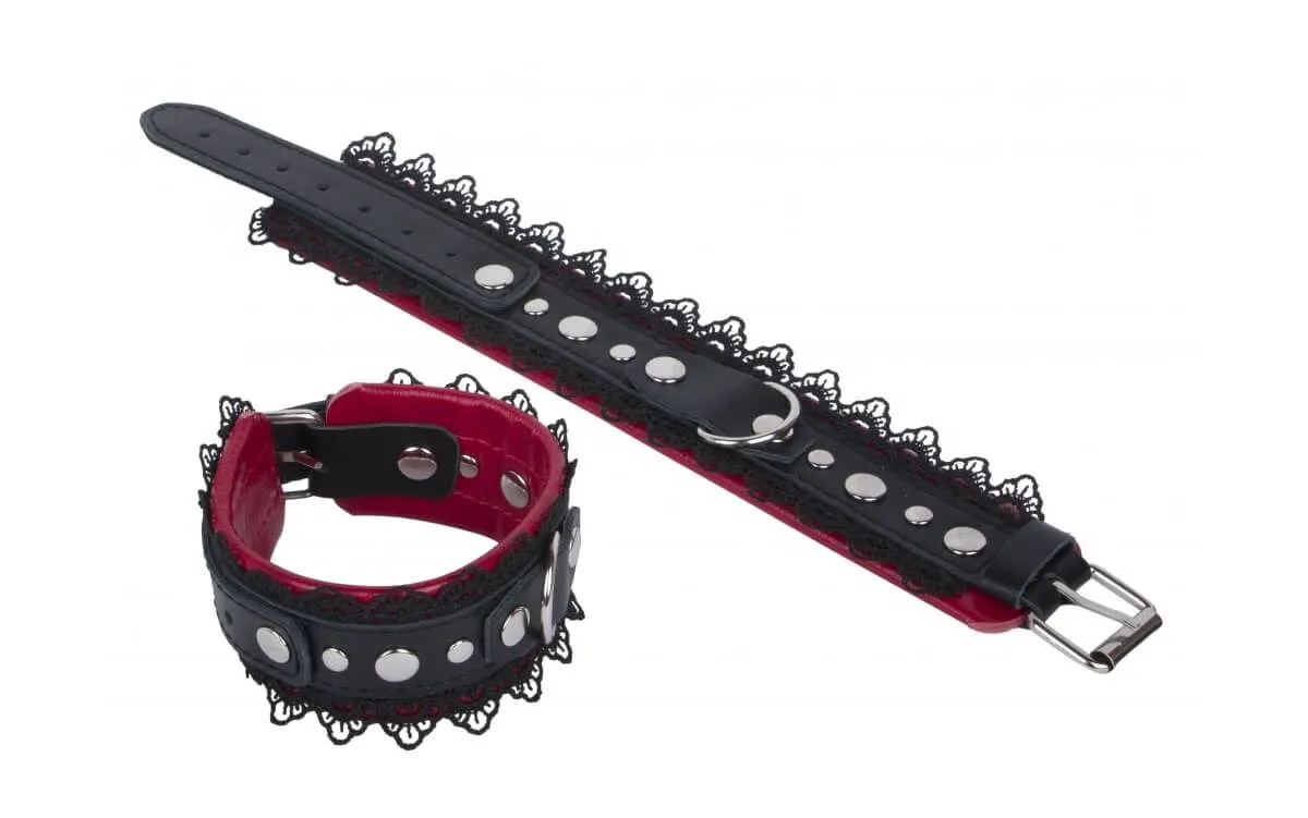 Наручники выполнены в викторианском стиле из натуральной кожи красного и черного цветов и декорированы тонким кружевом. На каждом наручнике есть D-кольцо, за которые их можно соединять между собой или же присоединить к ним другие бондажные аксессуары при помощи карабинов или стяжек.