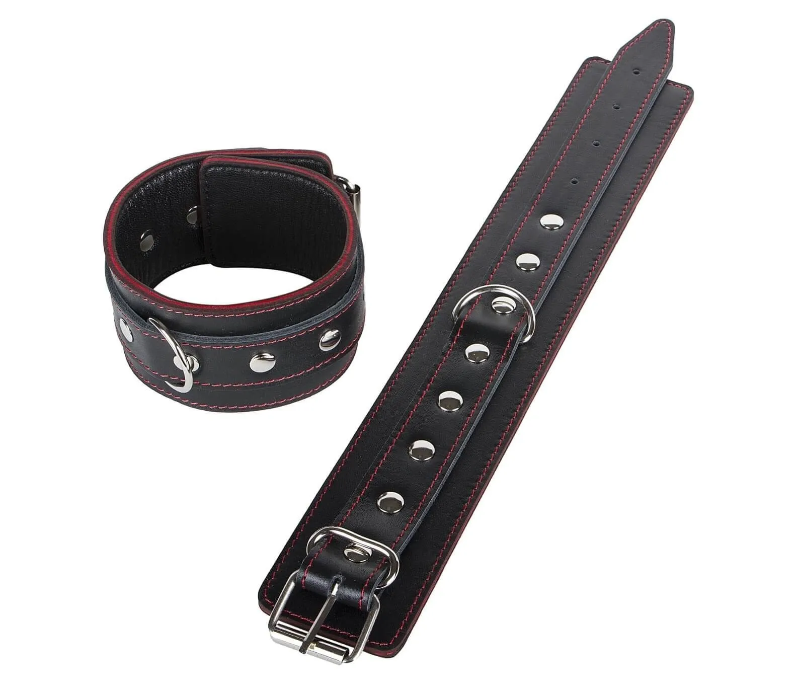 Поножи от компании Fire Horse помогут Вам сковать своего партнера, чтобы воплотить в жизнь все свои тайные фантазии и получить новые ощущения во время интимной близости. Поножи выполнены из натуральной кожи черного цвета и декорированы отстрочкой контрастного красного цвета. Также они украшены рядом металлических заклепок, придающим им более эффектный вид. На каждом поноже есть специальное D-кольцо, к которым можно прикрепить сцепку или другие бондажные аксессуары. Пробуйте различные варианты фиксации, ведь все зависит только от Вашей фантазии!
