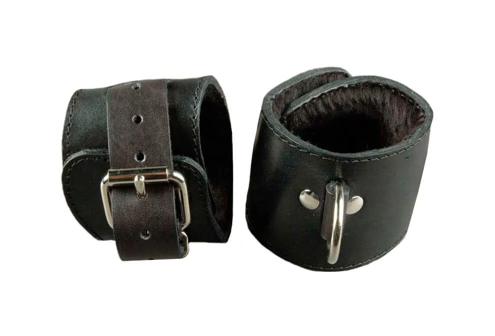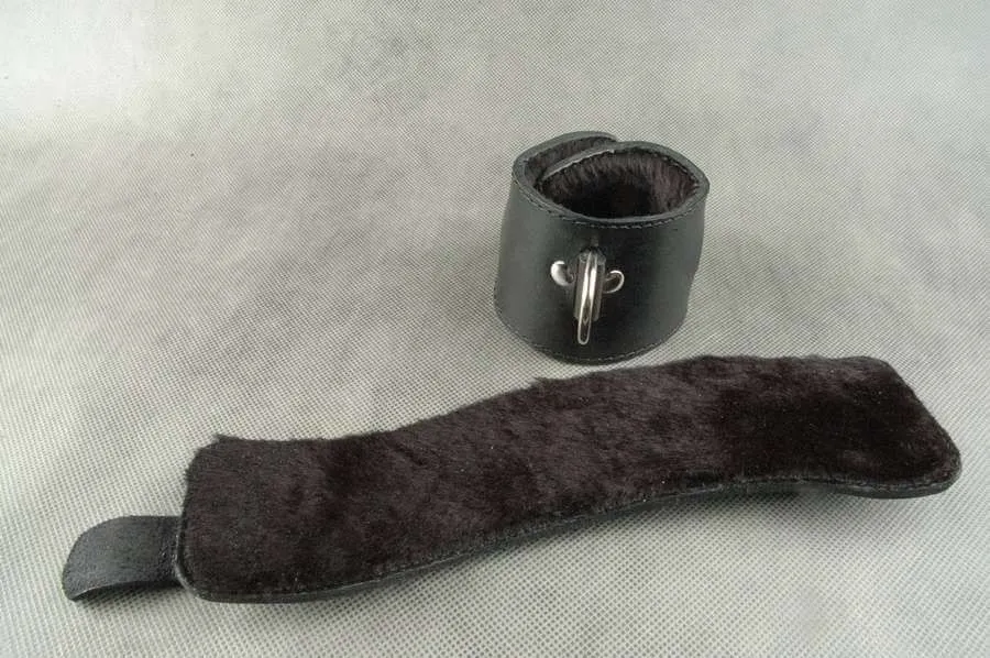 Наручники сделаны из натуральной кожи черного цвета и подшиты мутоном, который предотвратит натирание кожи. Без соединительной фиксации. Регулируются по размеру ремешком с пряжкой. Обхват запястья от 14 до 22 см.