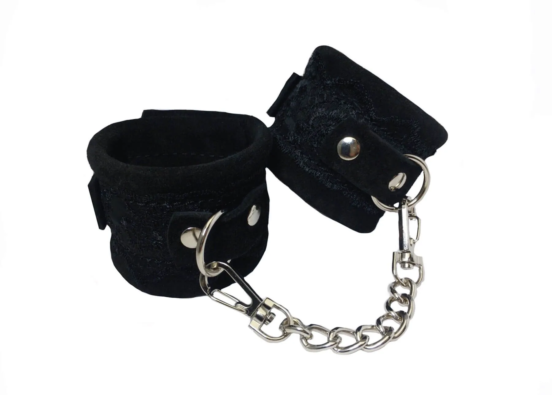Наручники сделаны из замши и декорированы тонким кружевом. Они соединены между собой металлической цепочкой на карабинах. Наручники регулируются по размеру ремешками с пряжками.