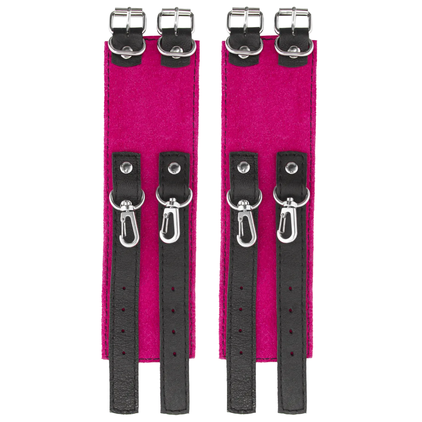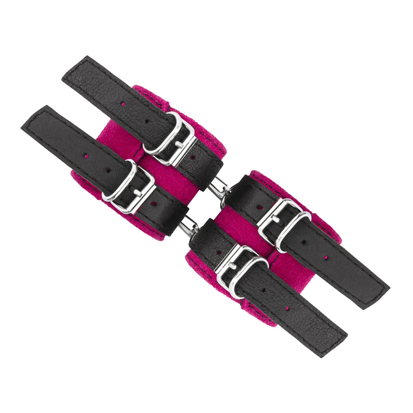Наручники соединены между собой металлическими карабинами. Их можно регулировать по размеру ремешками с пряжками.