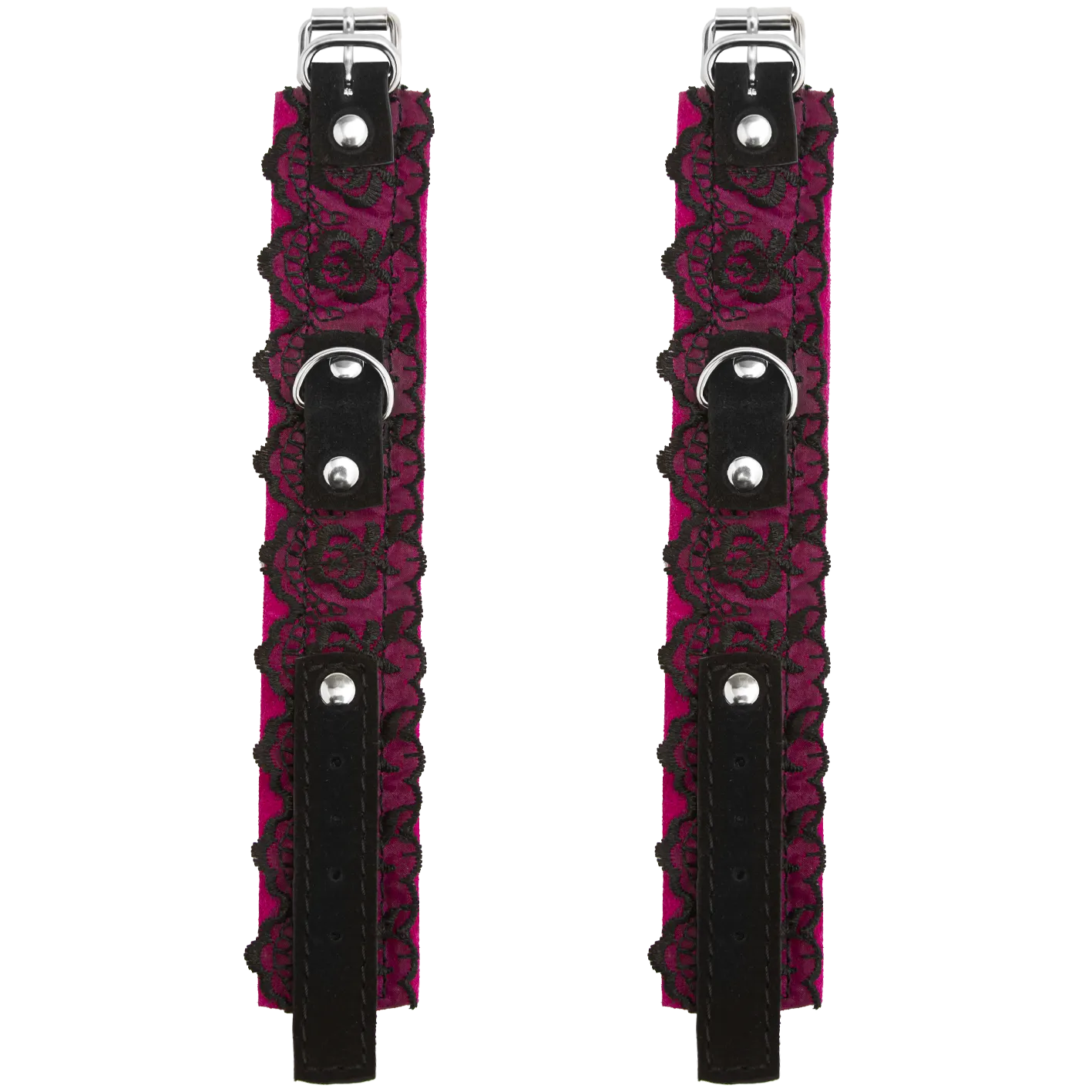 Наручники сделаны из замши и декорированы тонким кружевом. Они соединены между собой металлической цепочкой на карабинах. Наручники регулируются по размеру ремешками с пряжками.