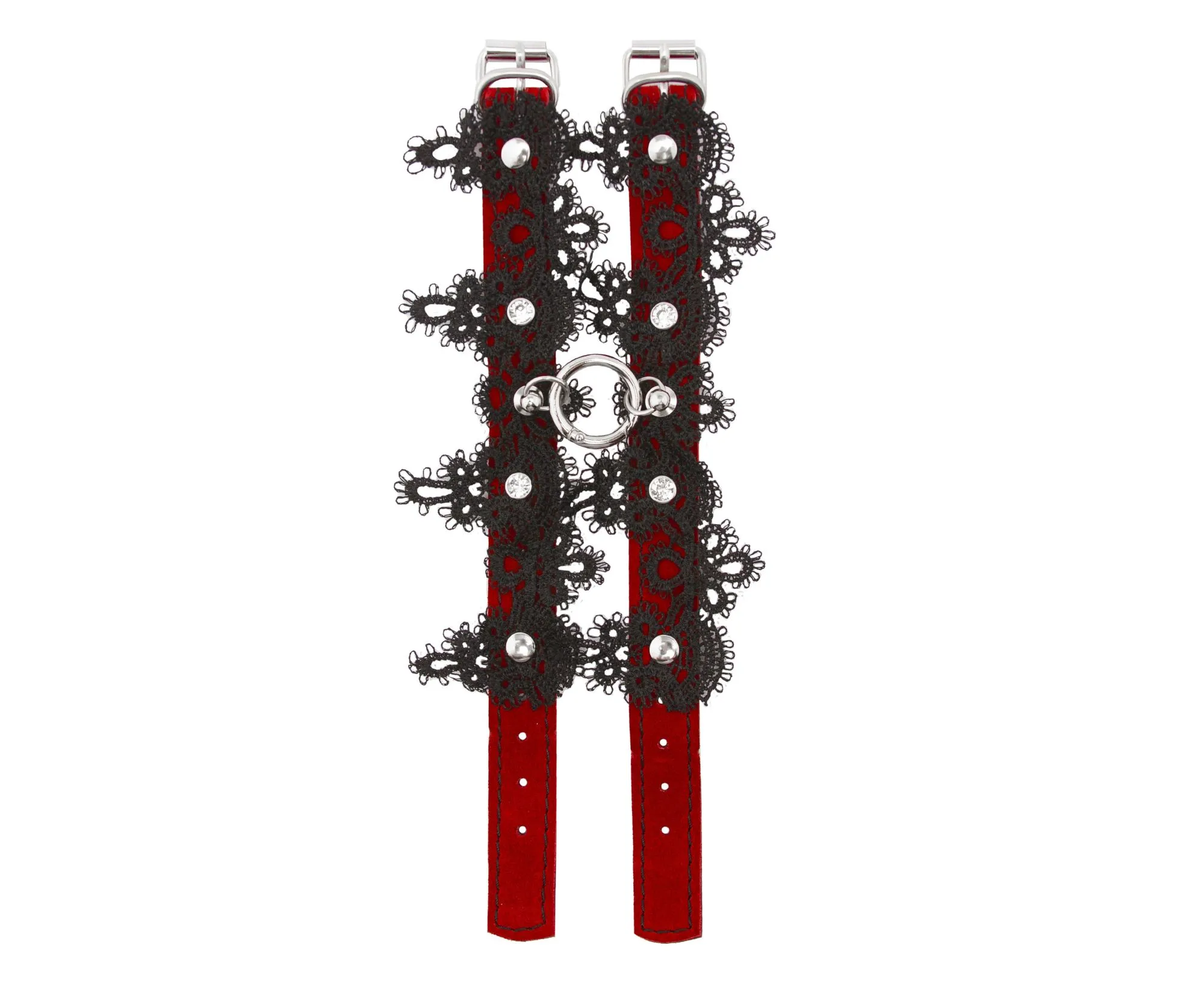 Наручники сделаны из замши и декорированы тонким кружевом. Они соединены между собой металлическим кольцом на карабинах. Наручники регулируются по размеру ремешками с пряжками.